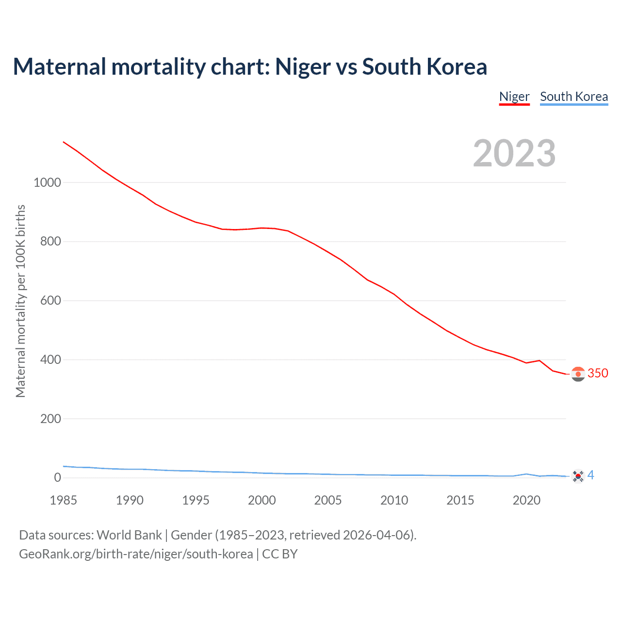 The maternal mortality rate, which is the probability of dying during childbirth or within 42 days of pregnancy termination, is 350 deaths per 100,000 live births in Niger, compared to 4 deaths in South Korea.