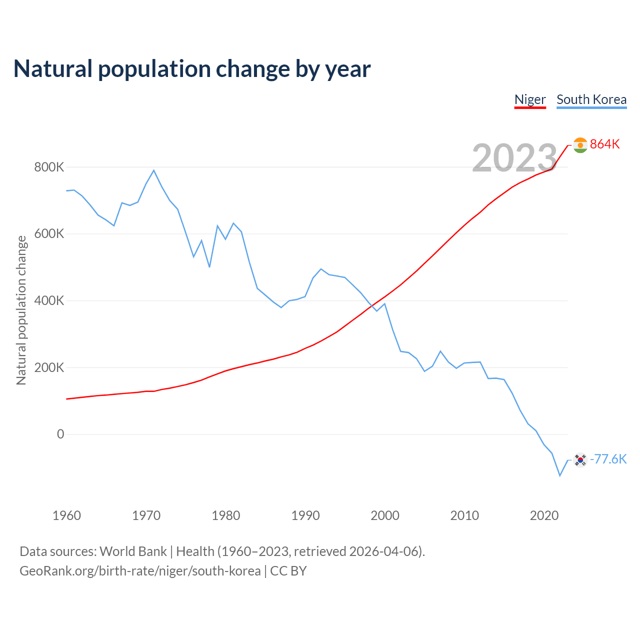 According to the latest available data on birth rates, the fertility rate in Niger was 6.06 children per woman in 2023, compared to 0.72 in South Korea in 2023. The replacement level is considered to be 2.1 children per woman.