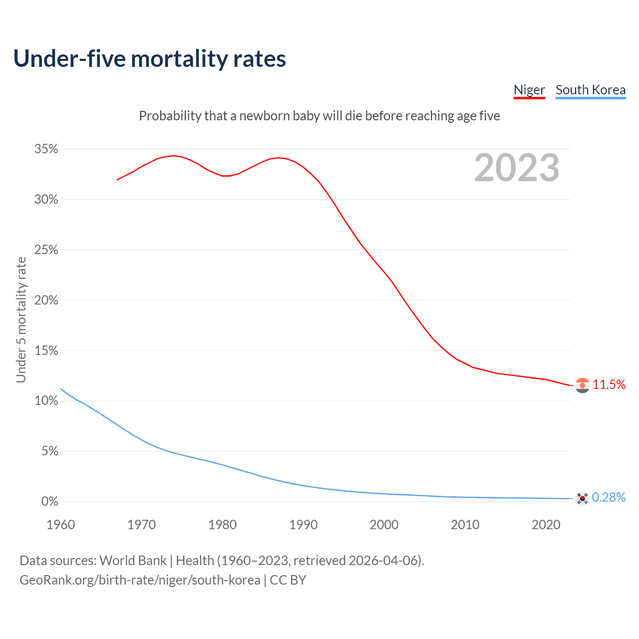 The chance that a newborn baby will die before reaching age five is 11.5% in Niger and 0.28% in South Korea. Above is a chart with historical data on under-five mortality rates.