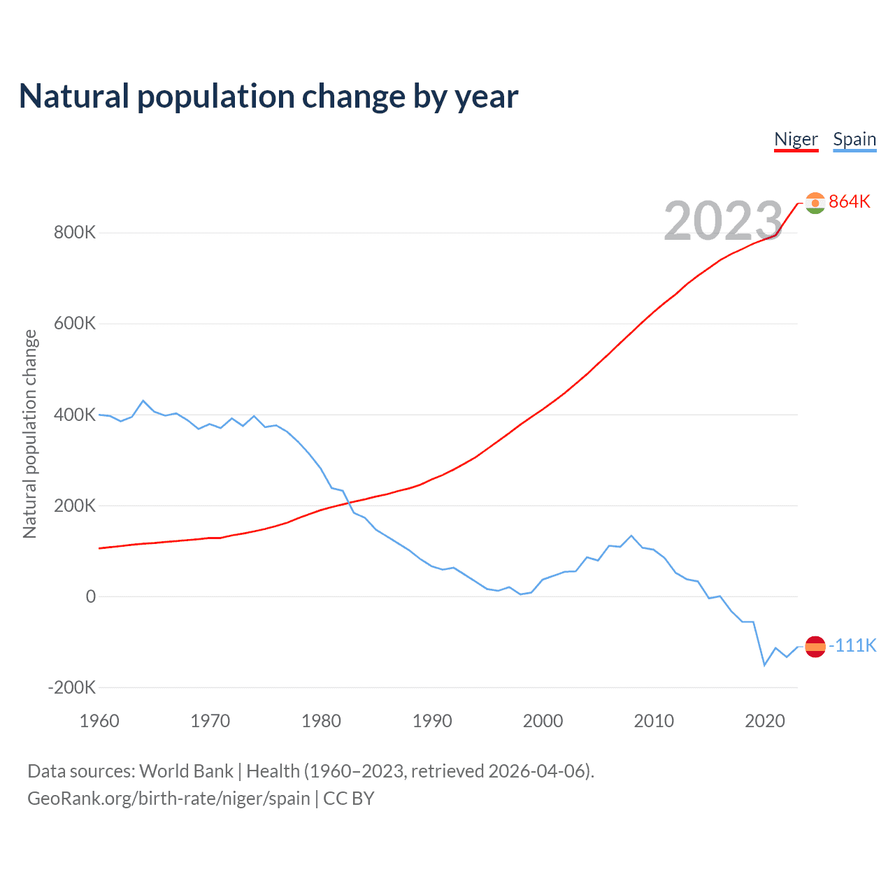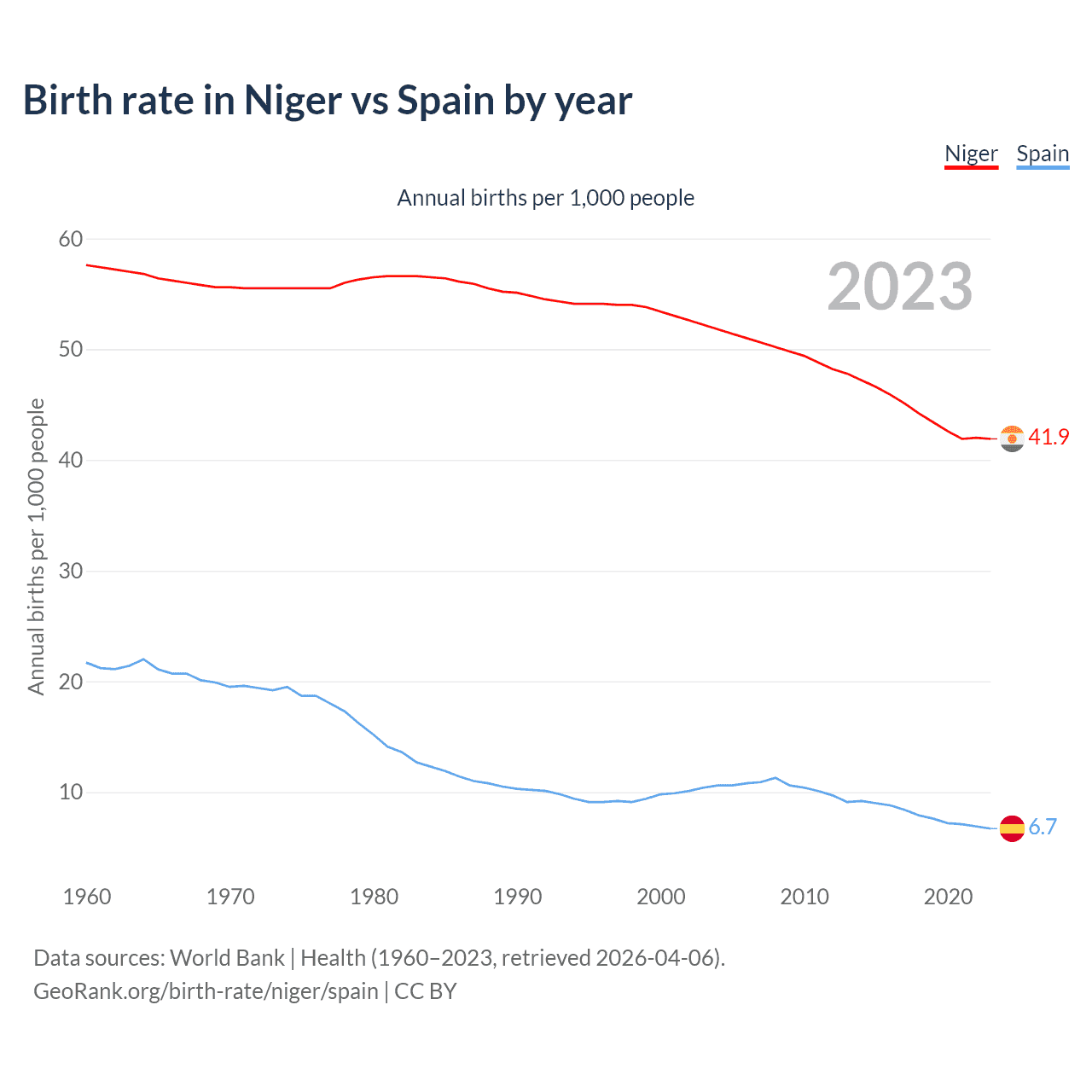 Niger has an annual birth rate of 41.9 births per 1,000 people, compared to 6.7 for Spain. The average number of children a woman is expected to have during her lifetime — the fertility rate, is 6.06 in Niger and 1.12 in Spain — 81.5% difference.