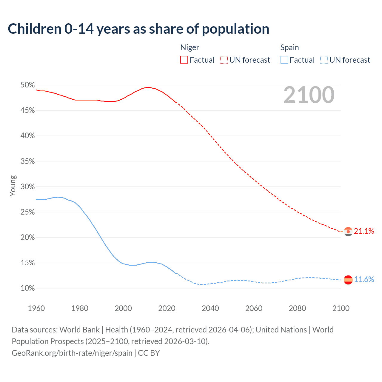 According to the latest available data on birth rates, the fertility rate in Niger was 6.06 children per woman in 2023, compared to 1.12 in Spain in 2023. The replacement level is considered to be 2.1 children per woman.