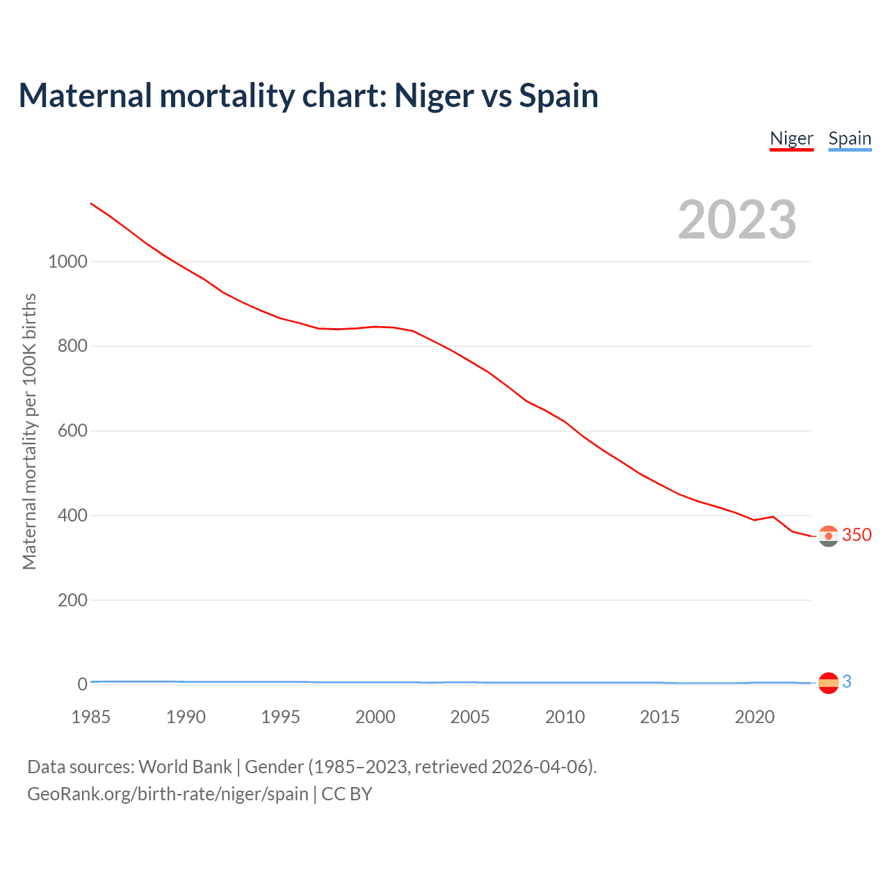 The maternal mortality rate, which is the probability of dying during childbirth or within 42 days of pregnancy termination, is 350 deaths per 100,000 live births in Niger, compared to 3 deaths in Spain.