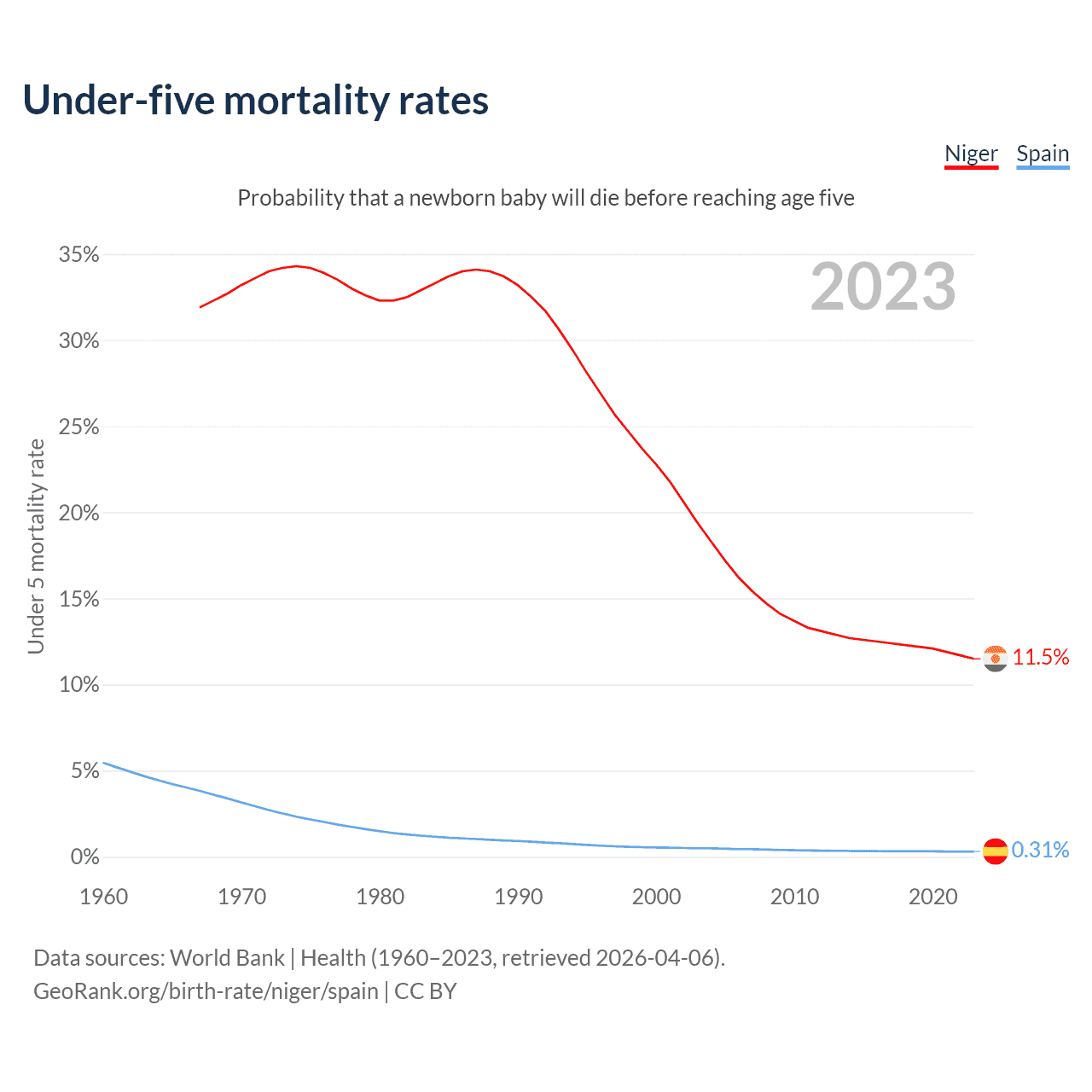 The chance that a newborn baby will die before reaching age five is 11.5% in Niger and 0.31% in Spain. Above is a chart with historical data on under-five mortality rates.
