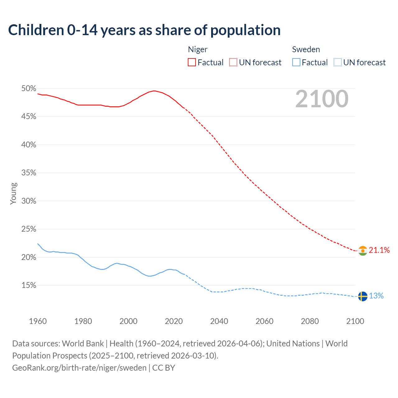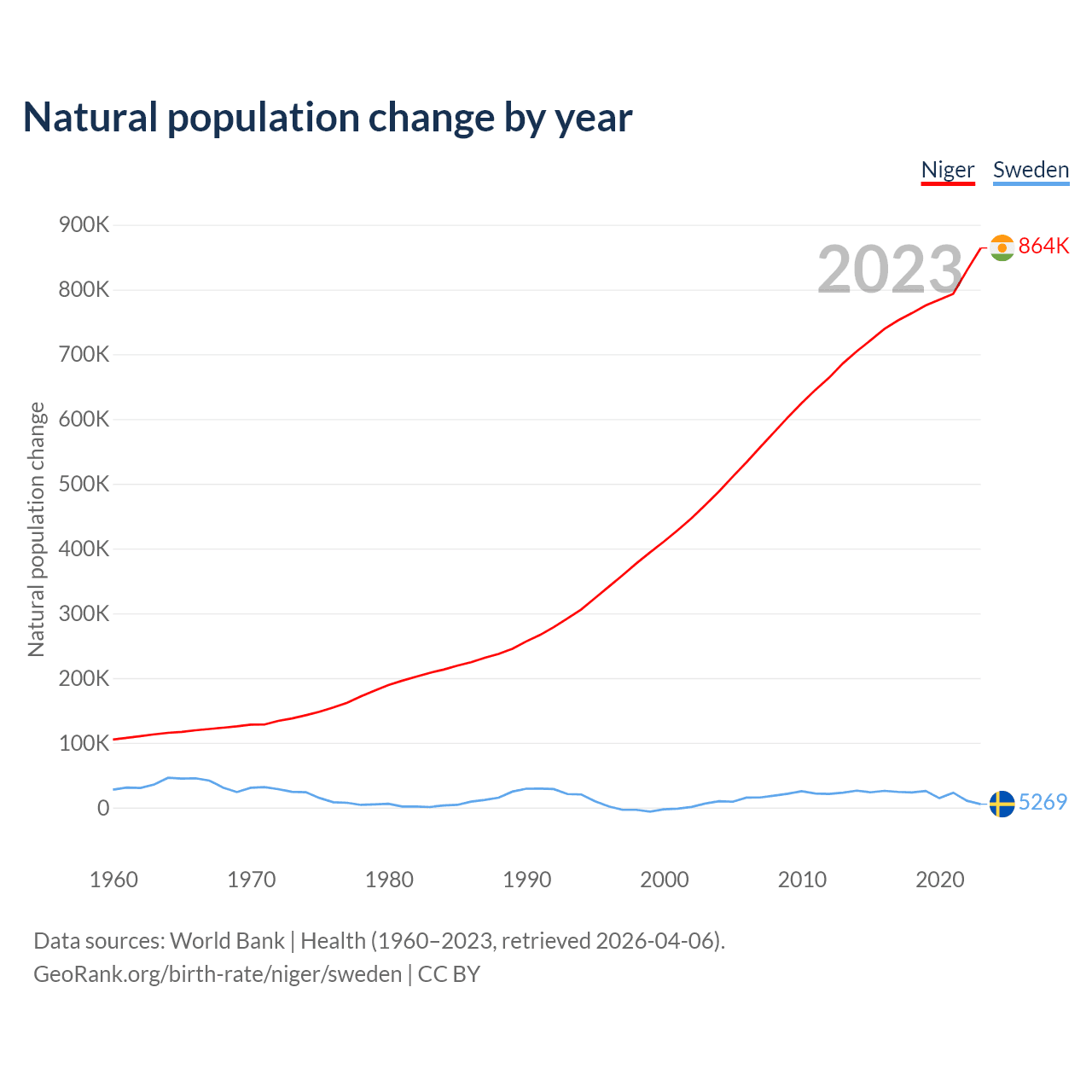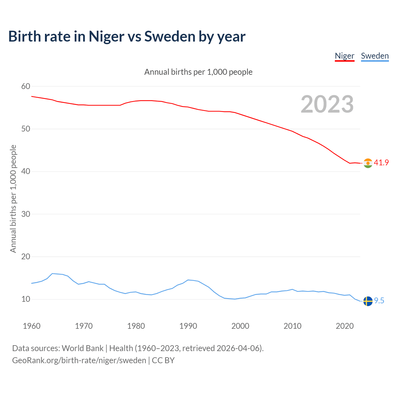Niger has an annual birth rate of 41.9 births per 1,000 people, compared to 9.5 for Sweden. The average number of children a woman is expected to have during her lifetime — the fertility rate, is 6.06 in Niger and 1.45 in Sweden — 76.1% difference.