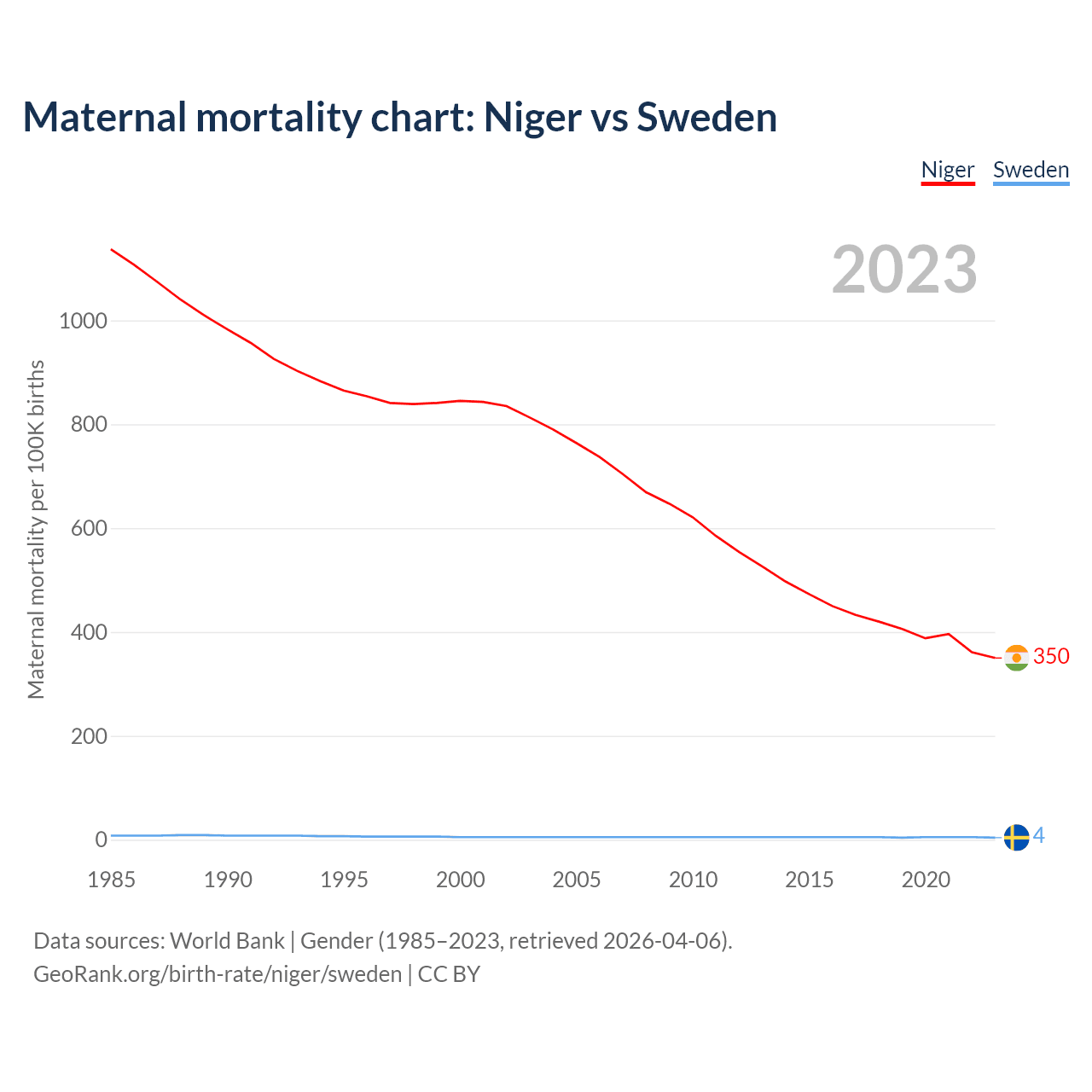 The maternal mortality rate, which is the probability of dying during childbirth or within 42 days of pregnancy termination, is 350 deaths per 100,000 live births in Niger, compared to 4 deaths in Sweden.