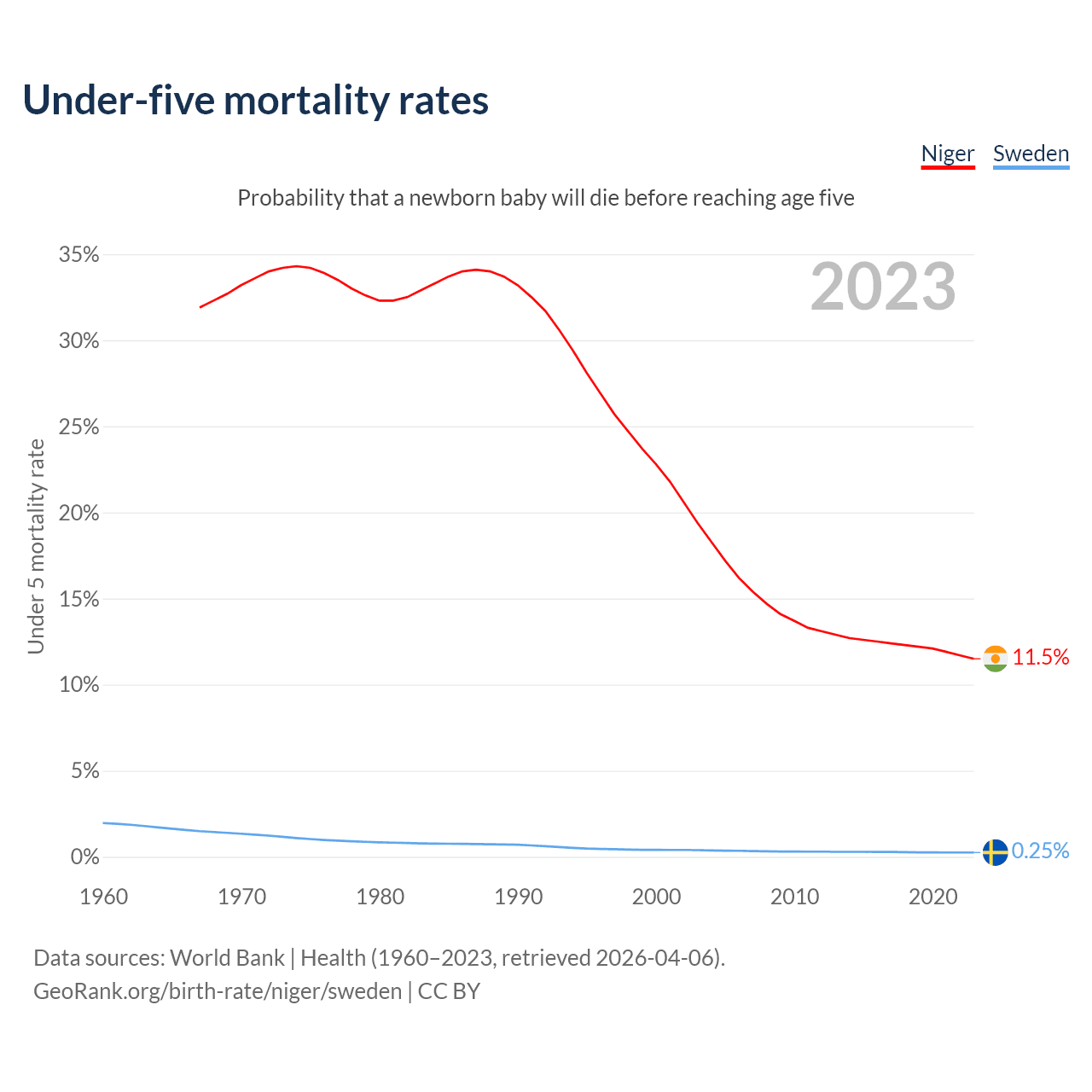 The chance that a newborn baby will die before reaching age five is 11.5% in Niger and 0.25% in Sweden. Above is a chart with historical data on under-five mortality rates.
