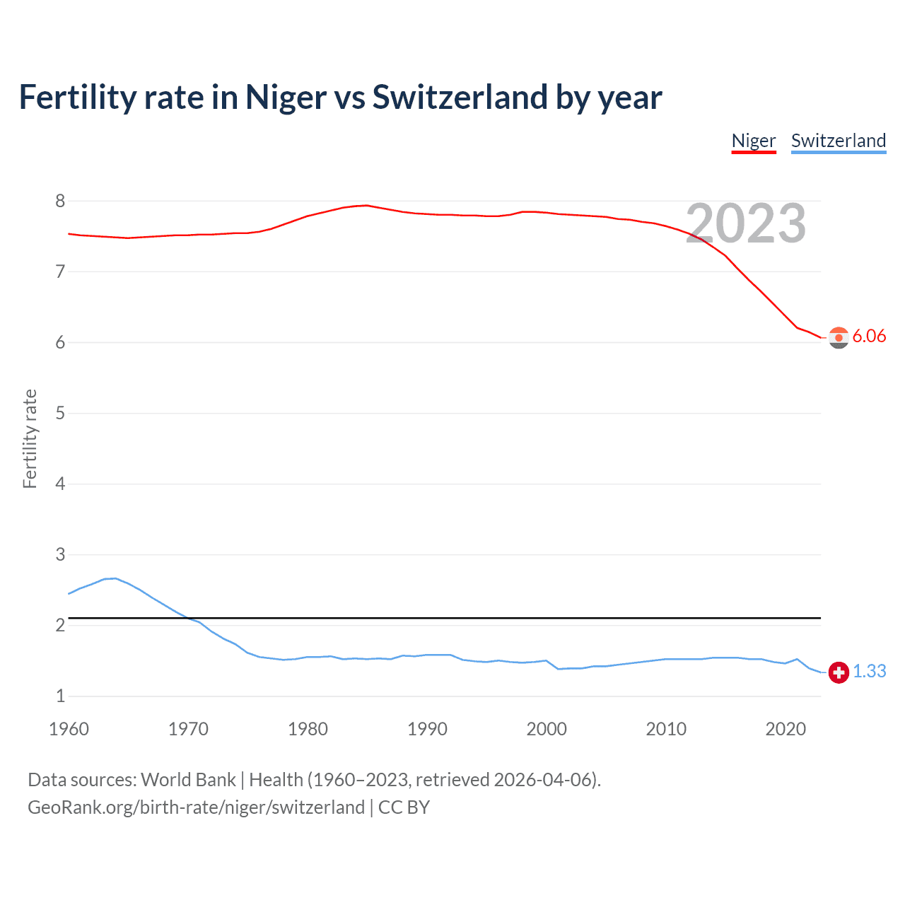 According to the latest available data on birth rates, the fertility rate in Niger was 6.06 children per woman in 2023, compared to 1.33 in Switzerland in 2023. The replacement level is considered to be 2.1 children per woman.