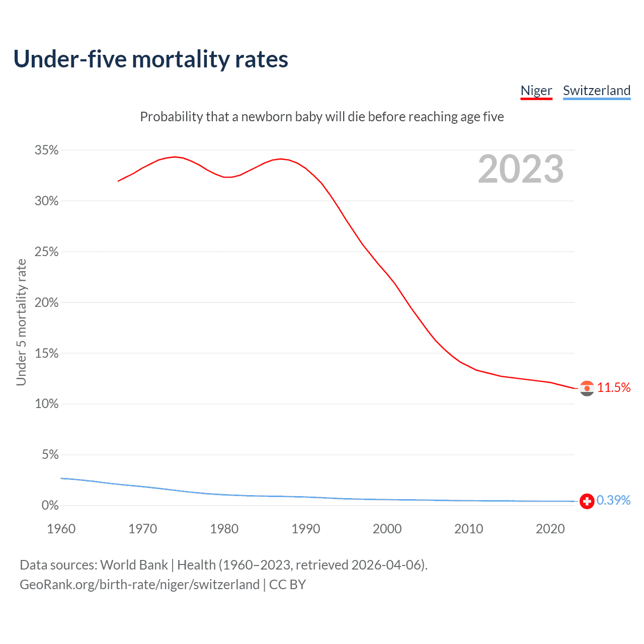 The chance that a newborn baby will die before reaching age five is 11.5% in Niger and 0.39% in Switzerland. Above is a chart with historical data on under-five mortality rates.