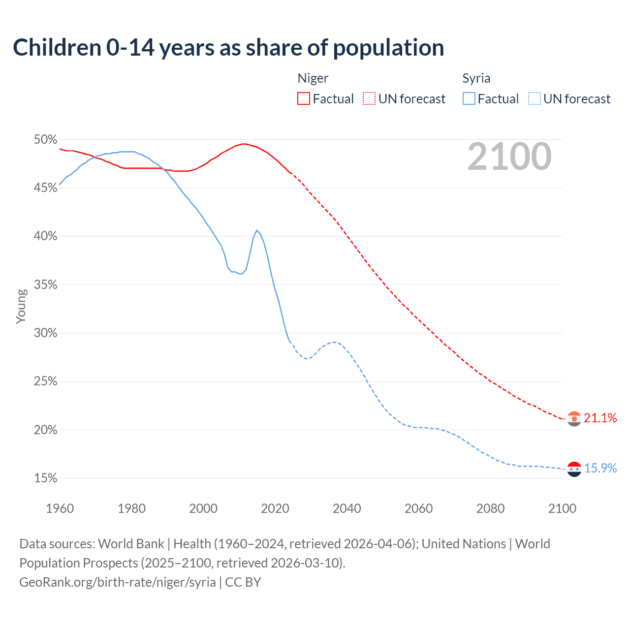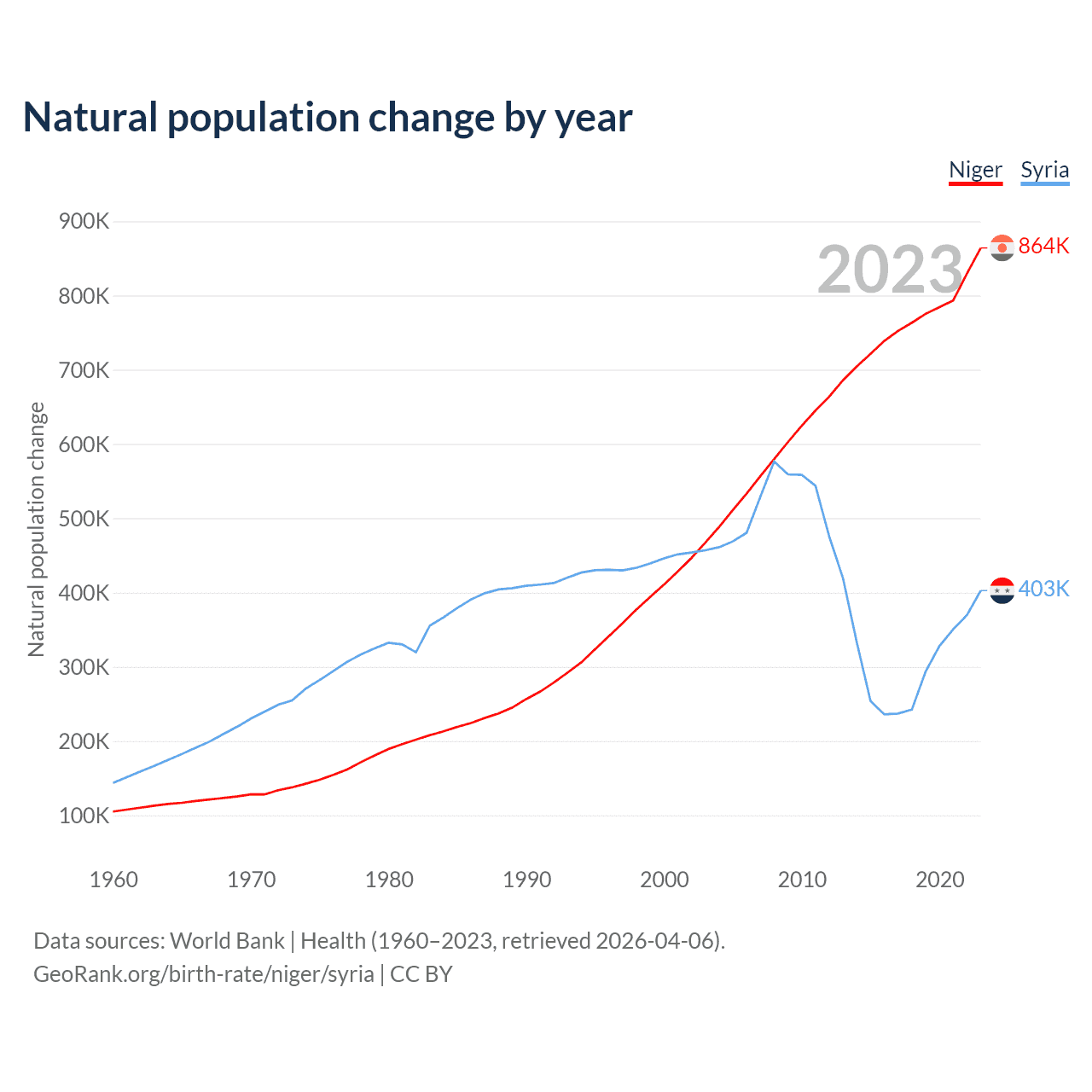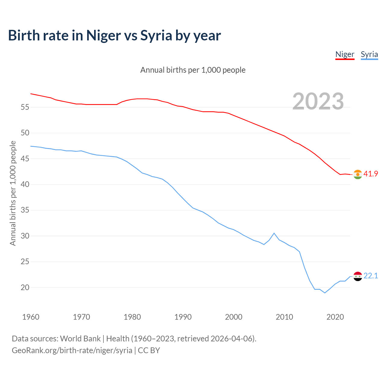 Niger has an annual birth rate of 41.9 births per 1,000 people, compared to 22.1 for Syria. The average number of children a woman is expected to have during her lifetime — the fertility rate, is 6.06 in Niger and 2.71 in Syria — 55.3% difference.