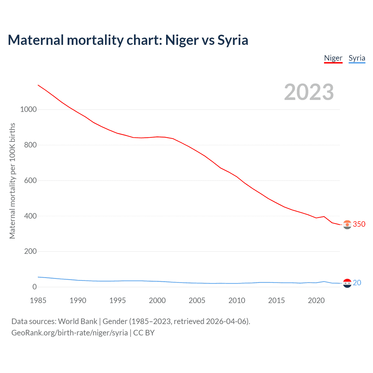 The maternal mortality rate, which is the probability of dying during childbirth or within 42 days of pregnancy termination, is 350 deaths per 100,000 live births in Niger, compared to 20 deaths in Syria.