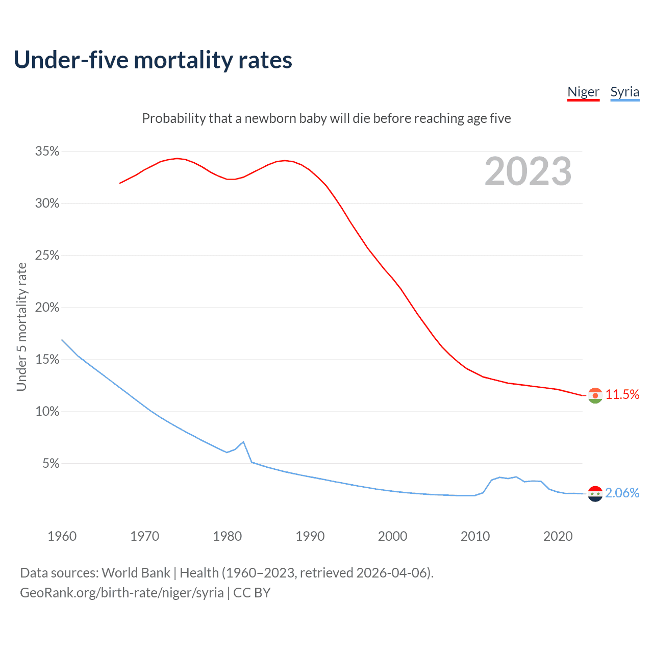 The chance that a newborn baby will die before reaching age five is 11.5% in Niger and 2.06% in Syria. Above is a chart with historical data on under-five mortality rates.