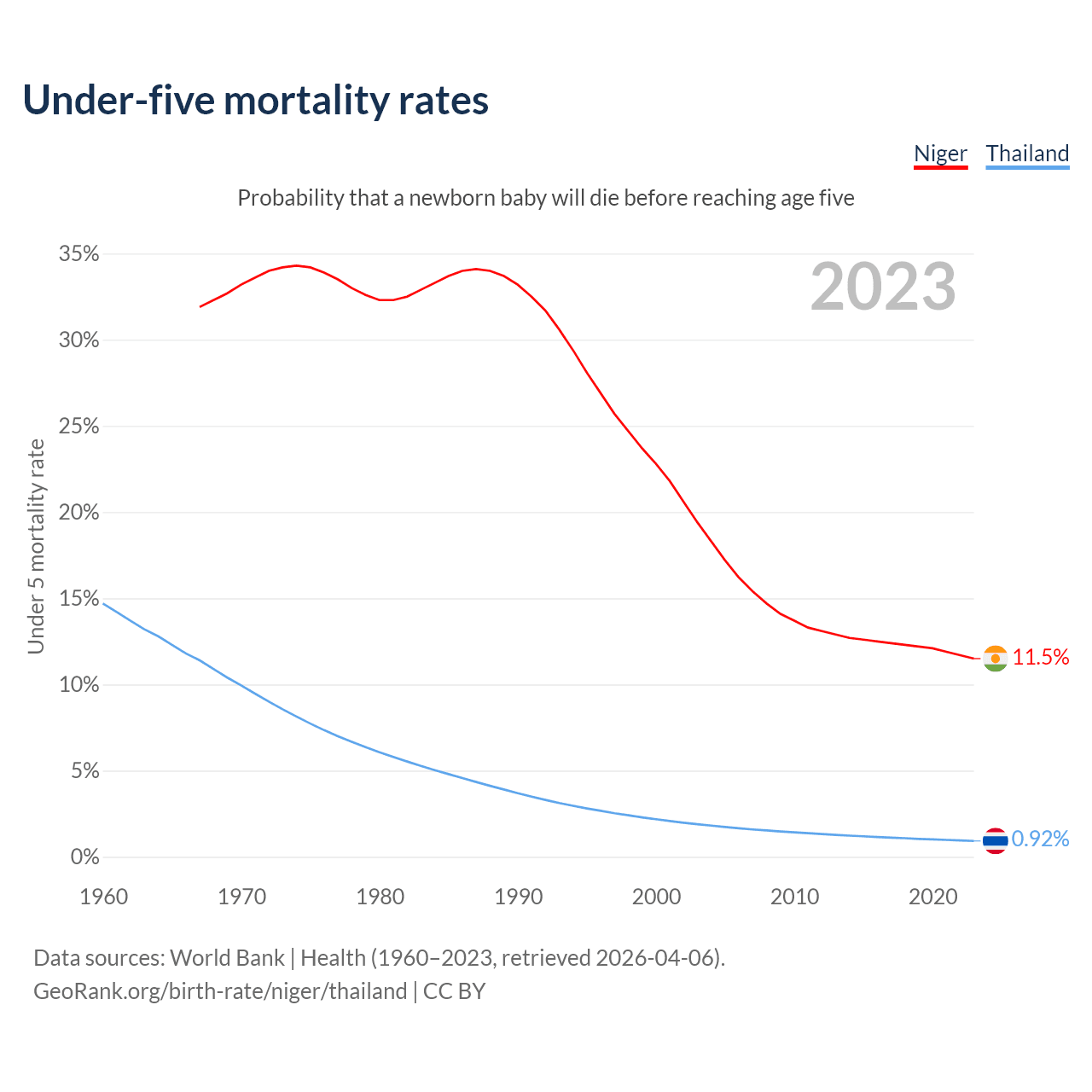 The chance that a newborn baby will die before reaching age five is 11.5% in Niger and 0.92% in Thailand. Above is a chart with historical data on under-five mortality rates.