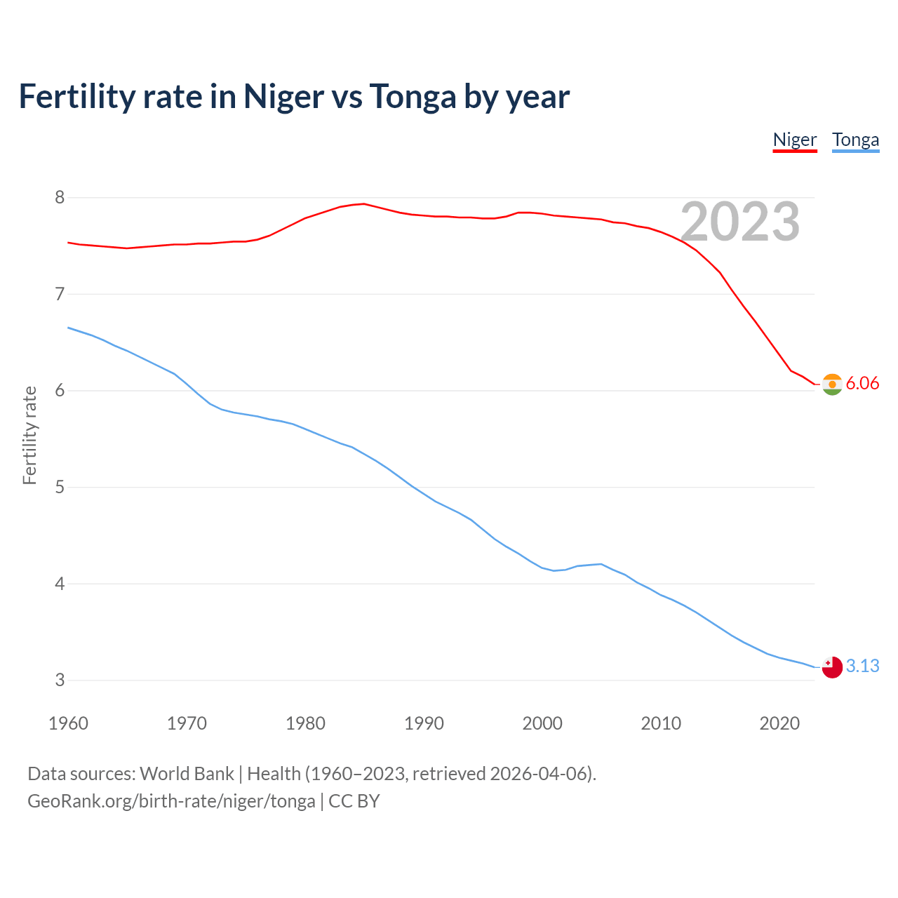 1960 vs 2023, the fertility rate has decreased by 19.5% in Niger and by 53% in Tonga — in 1960, it was 7.53 and 6.65, respectively.