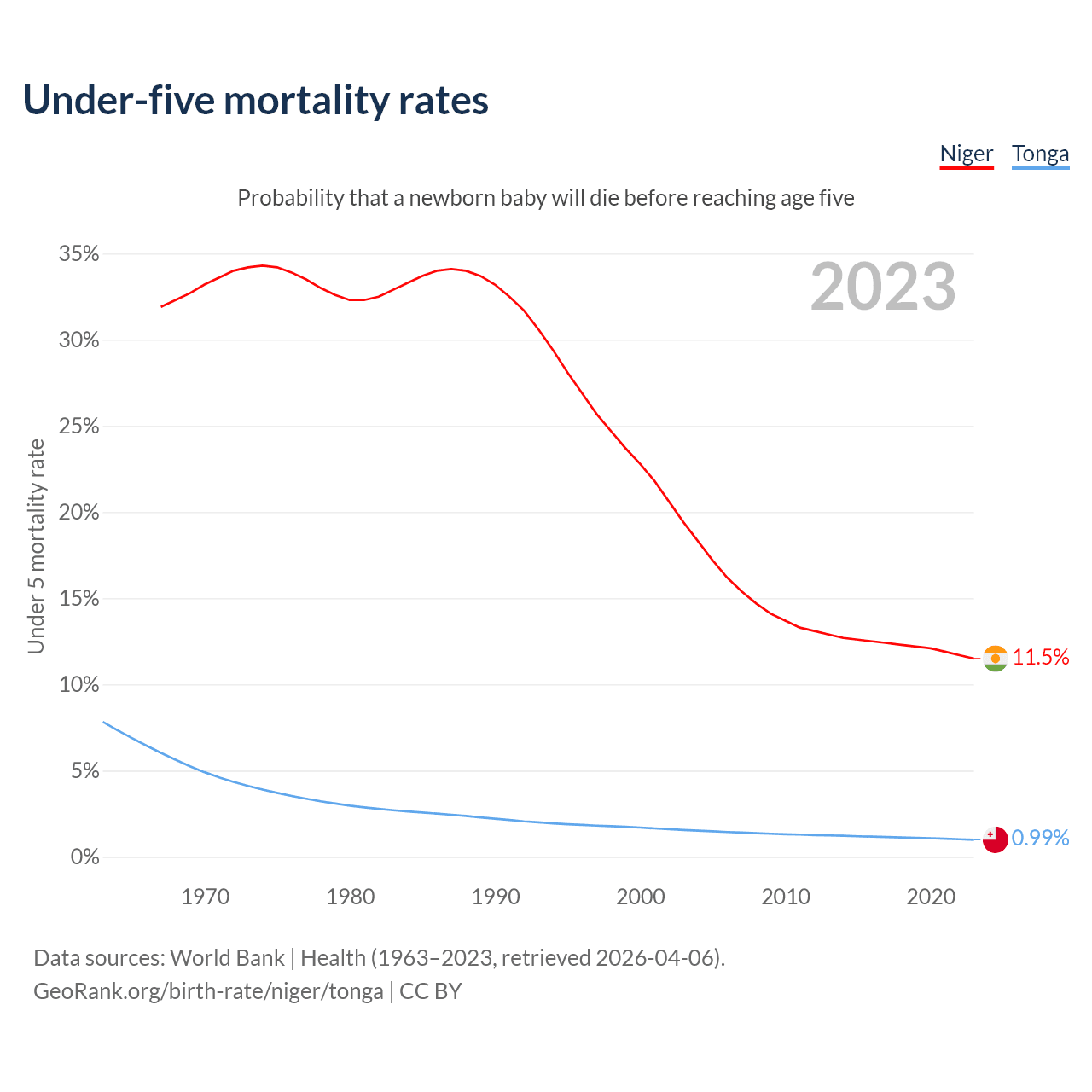 The chance that a newborn baby will die before reaching age five is 11.5% in Niger and 0.99% in Tonga. Above is a chart with historical data on under-five mortality rates.