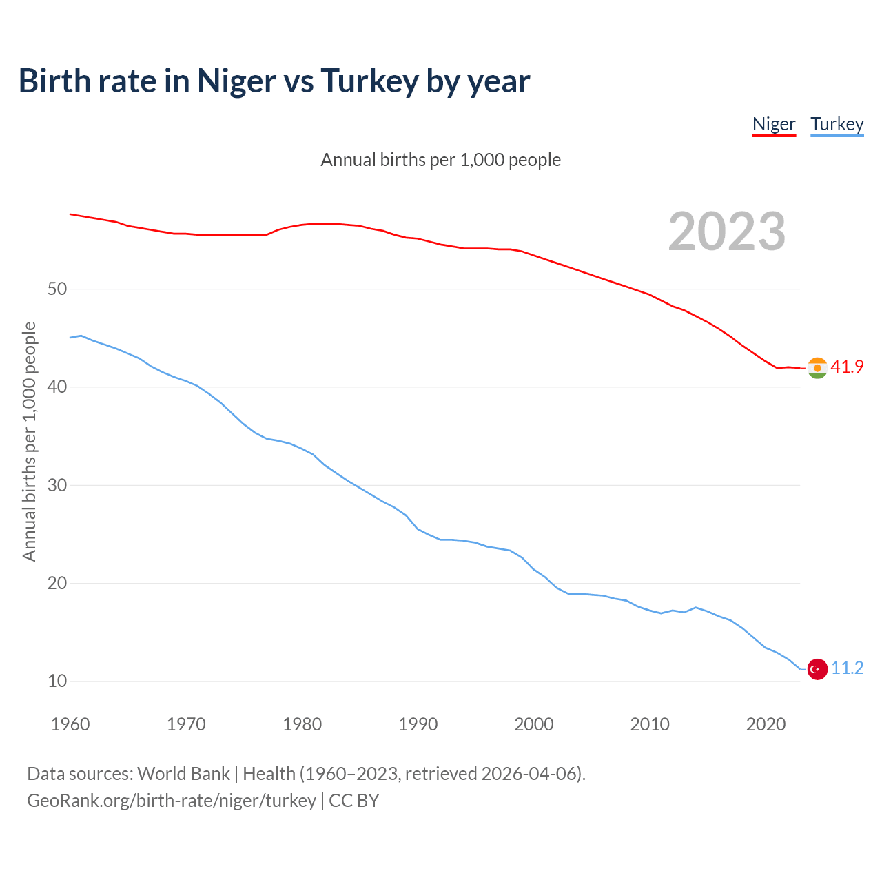 Niger has an annual birth rate of 41.9 births per 1,000 people, compared to 11.2 for Turkey. The average number of children a woman is expected to have during her lifetime — the fertility rate, is 6.06 in Niger and 1.51 in Turkey — 75.1% difference.