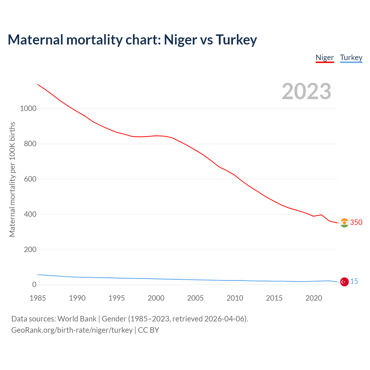 The maternal mortality rate, which is the probability of dying during childbirth or within 42 days of pregnancy termination, is 350 deaths per 100,000 live births in Niger, compared to 15 deaths in Turkey.
