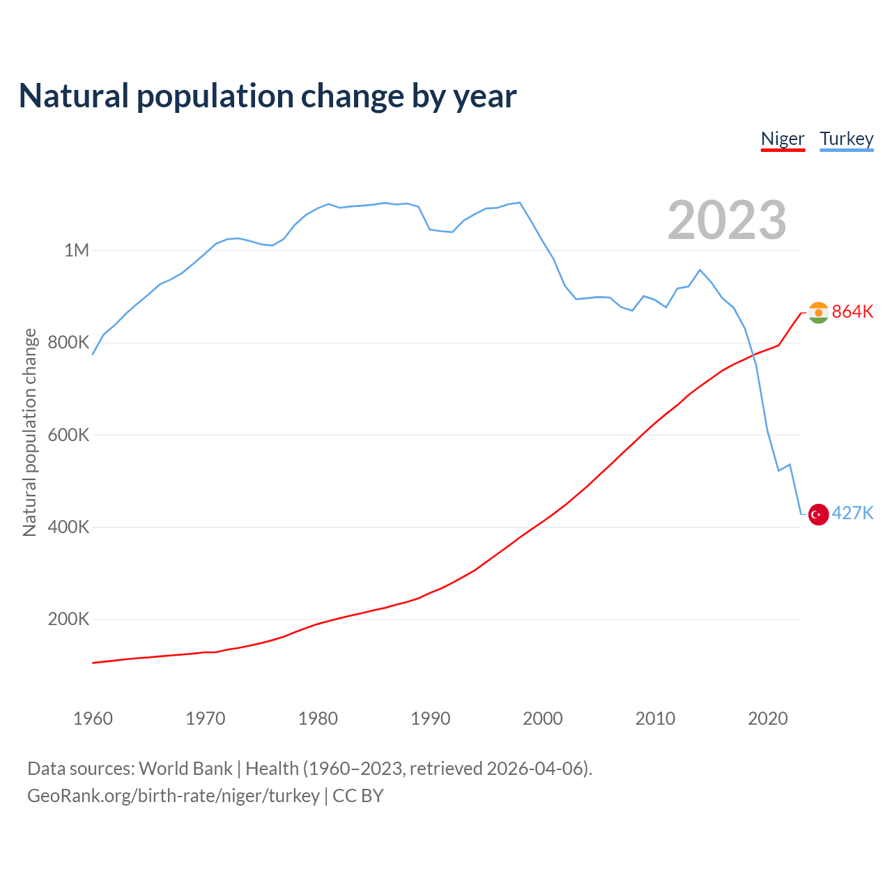 According to the latest available data on birth rates, the fertility rate in Niger was 6.06 children per woman in 2023, compared to 1.51 in Turkey in 2023. The replacement level is considered to be 2.1 children per woman.