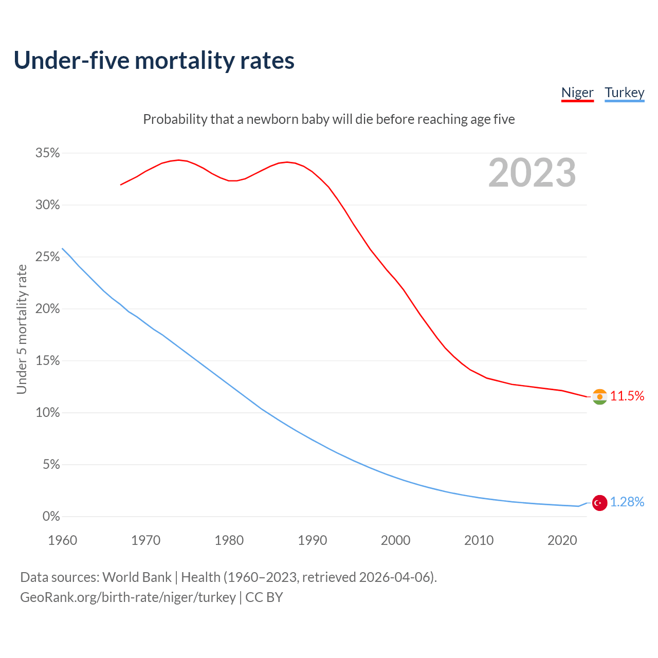 The chance that a newborn baby will die before reaching age five is 11.5% in Niger and 1.28% in Turkey. Above is a chart with historical data on under-five mortality rates.