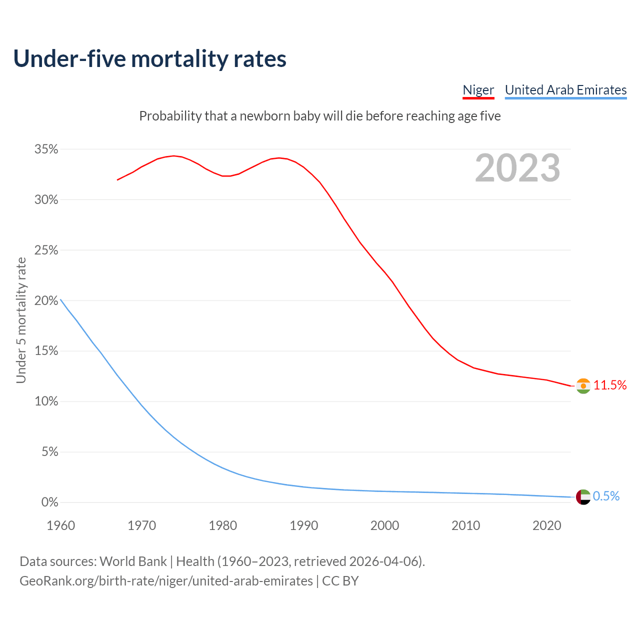 The chance that a newborn baby will die before reaching age five is 11.5% in Niger and 0.5% in the United Arab Emirates. Above is a chart with historical data on under-five mortality rates.