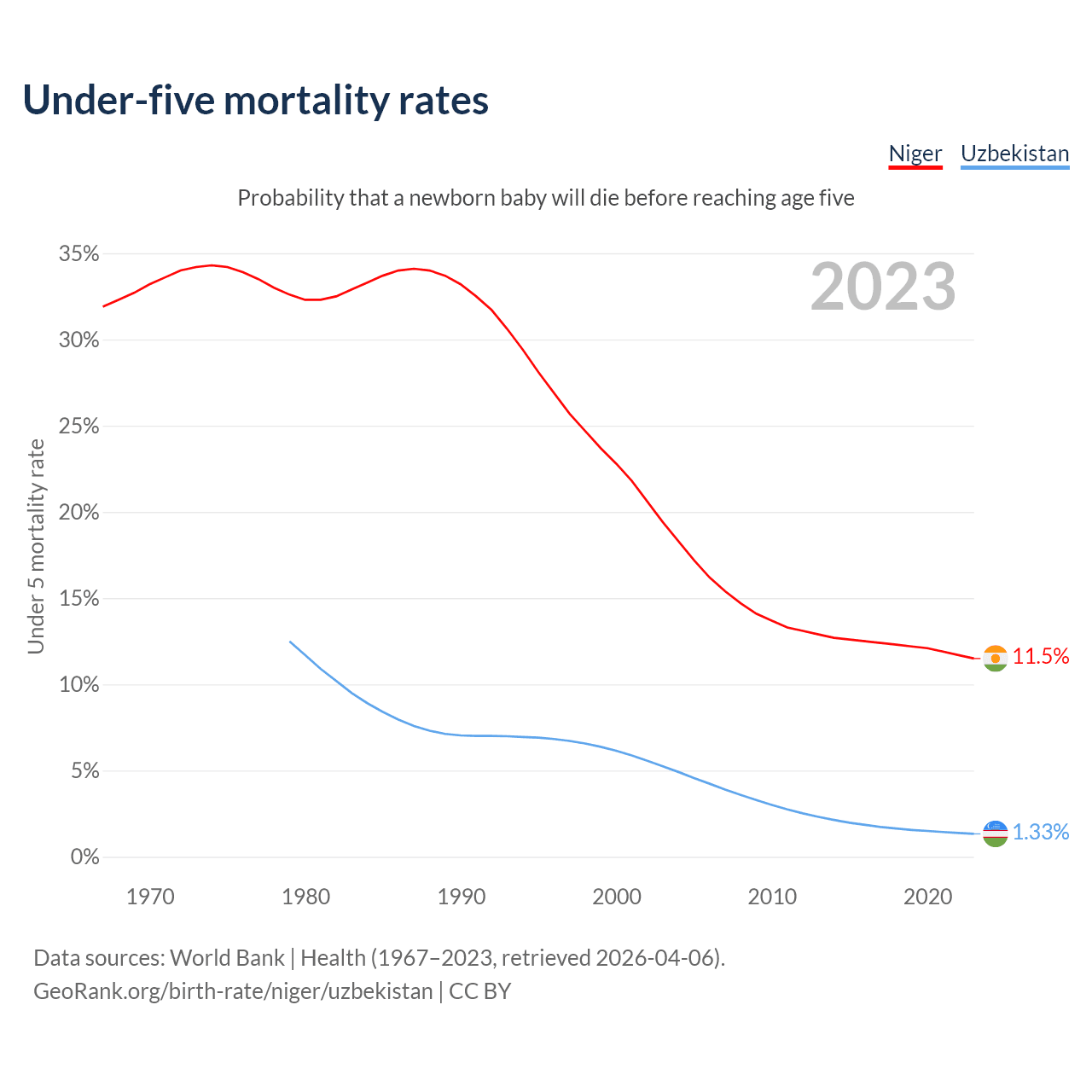 The chance that a newborn baby will die before reaching age five is 11.5% in Niger and 1.33% in Uzbekistan. Above is a chart with historical data on under-five mortality rates.