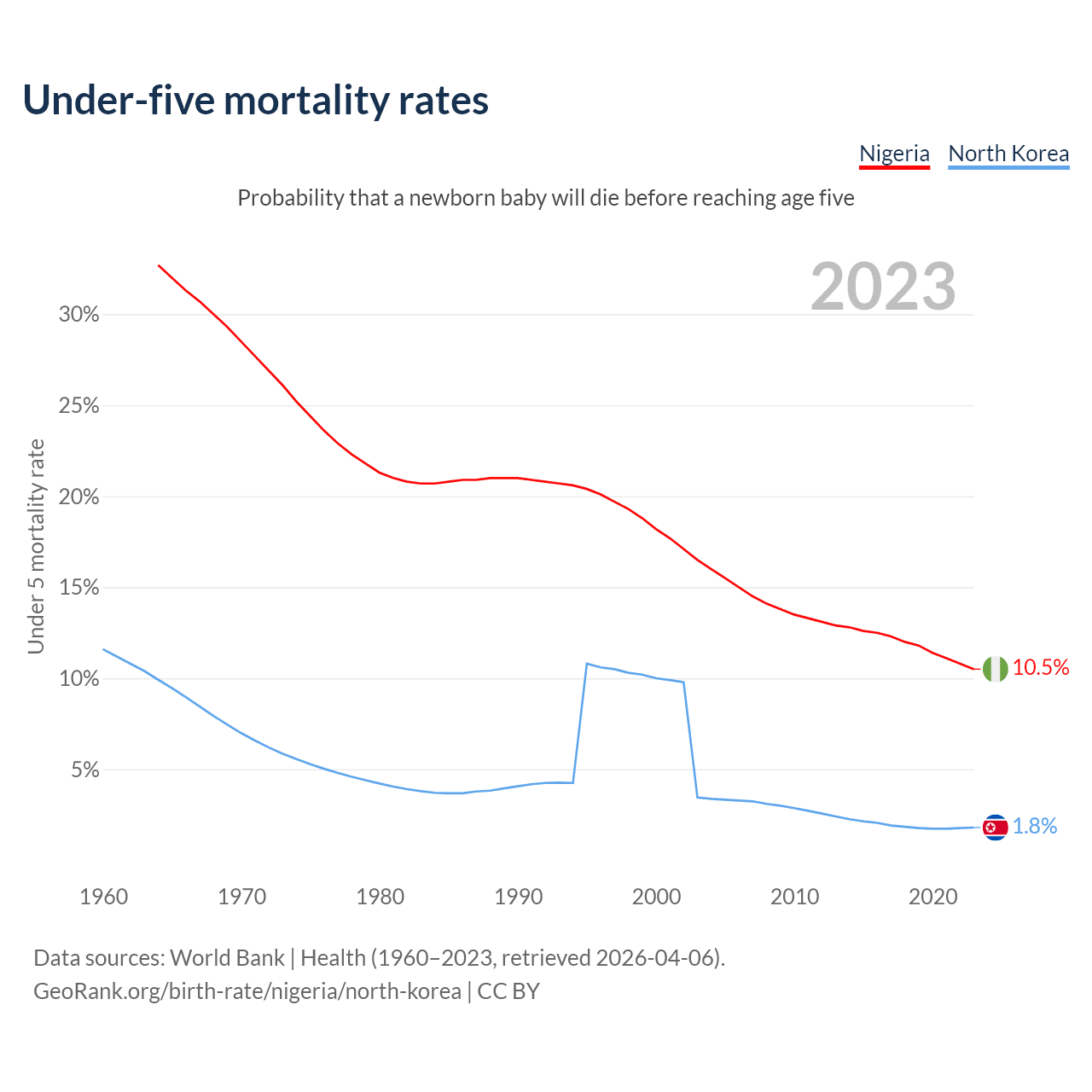 The chance that a newborn baby will die before reaching age five is 10.5% in Nigeria and 1.8% in North Korea. Above is a chart with historical data on under-five mortality rates.