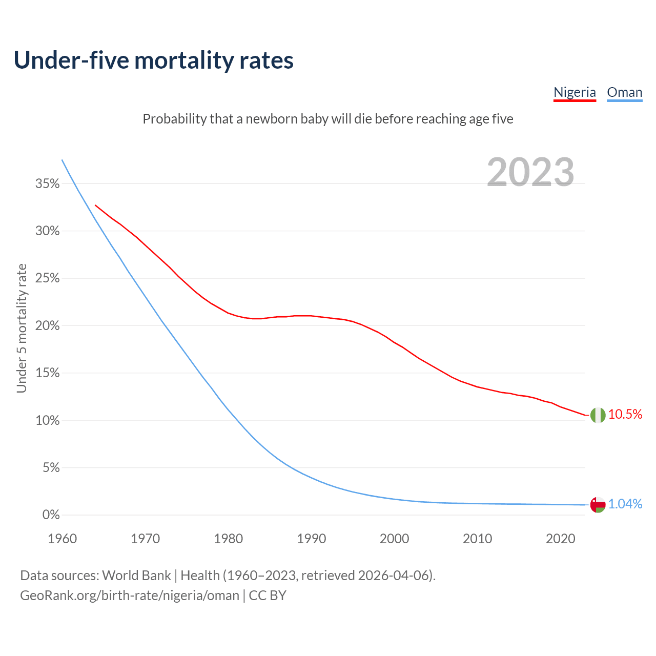 The chance that a newborn baby will die before reaching age five is 10.5% in Nigeria and 1.04% in Oman. Above is a chart with historical data on under-five mortality rates.