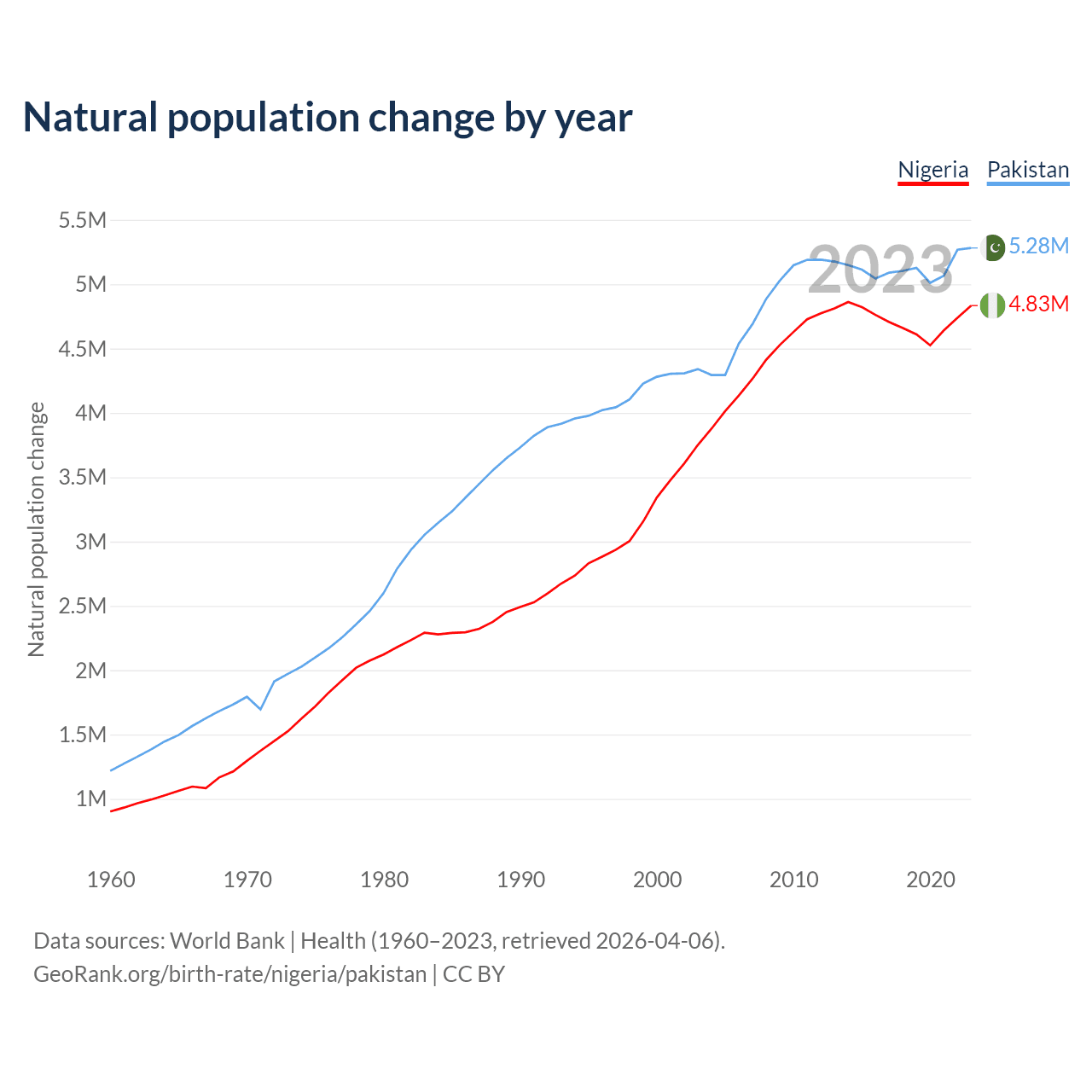 According to the latest available data on birth rates, the fertility rate in Nigeria was 4.48 children per woman in 2023, compared to 3.61 in Pakistan in 2023. The replacement level is considered to be 2.1 children per woman.