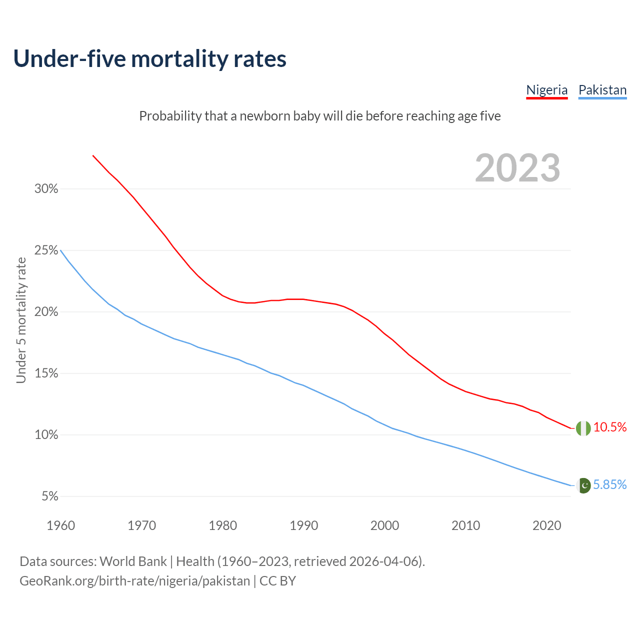 The chance that a newborn baby will die before reaching age five is 10.5% in Nigeria and 5.85% in Pakistan. Above is a chart with historical data on under-five mortality rates.