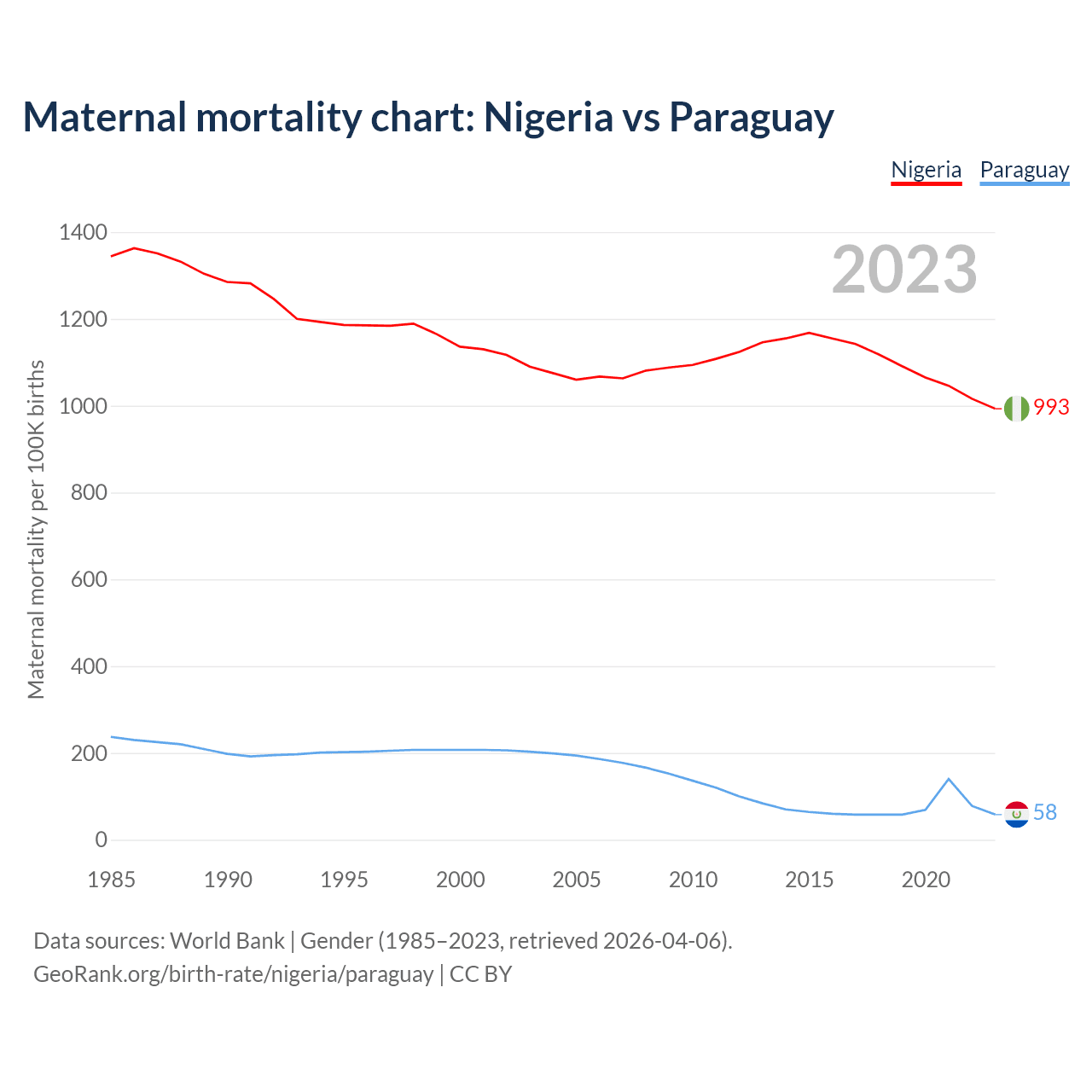 The maternal mortality rate, which is the probability of dying during childbirth or within 42 days of pregnancy termination, is 993 deaths per 100,000 live births in Nigeria, compared to 58 deaths in Paraguay.