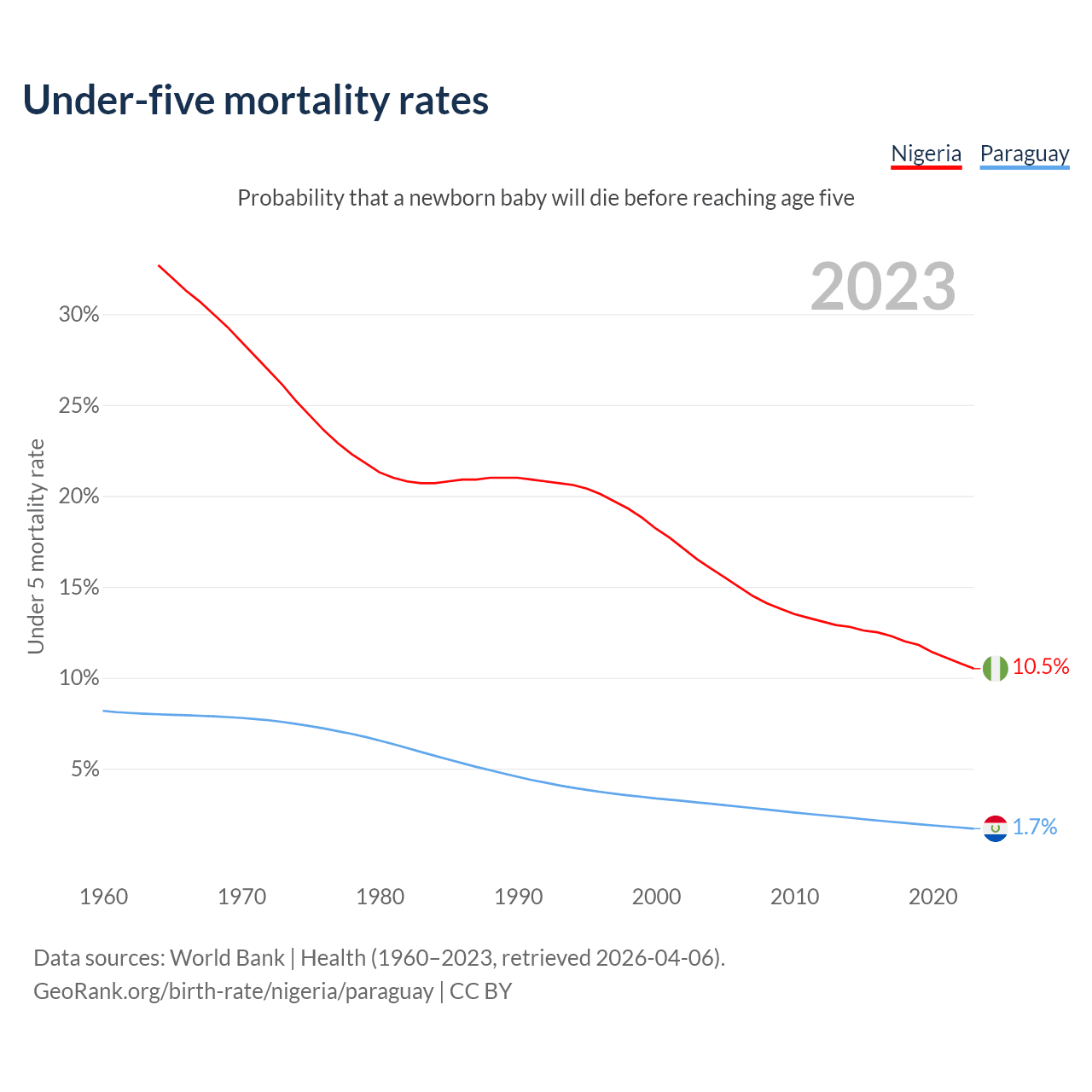The chance that a newborn baby will die before reaching age five is 10.5% in Nigeria and 1.7% in Paraguay. Above is a chart with historical data on under-five mortality rates.