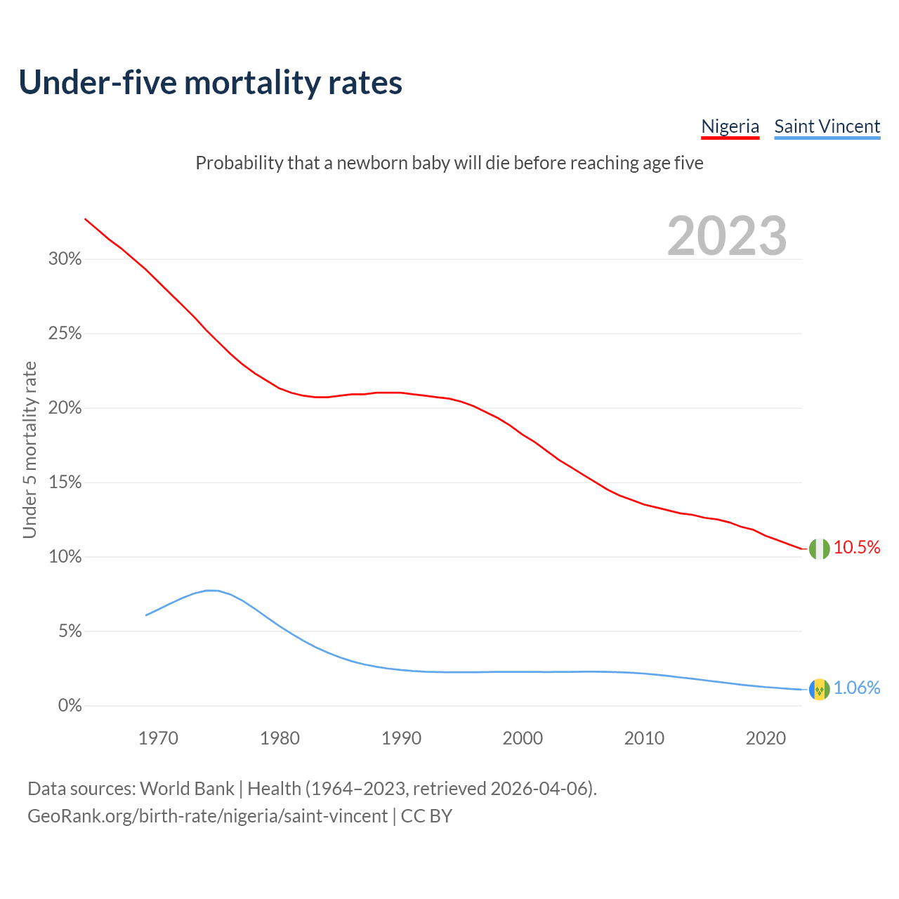 The chance that a newborn baby will die before reaching age five is 10.5% in Nigeria and 1.06% in Saint Vincent. Above is a chart with historical data on under-five mortality rates.