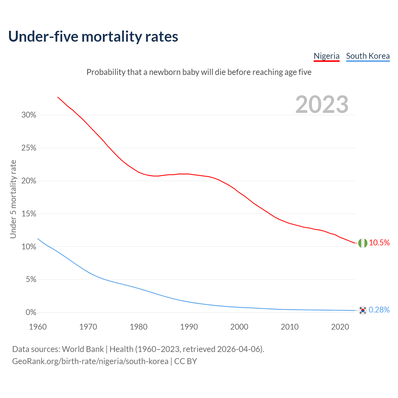 The chance that a newborn baby will die before reaching age five is 10.5% in Nigeria and 0.28% in South Korea. Above is a chart with historical data on under-five mortality rates.