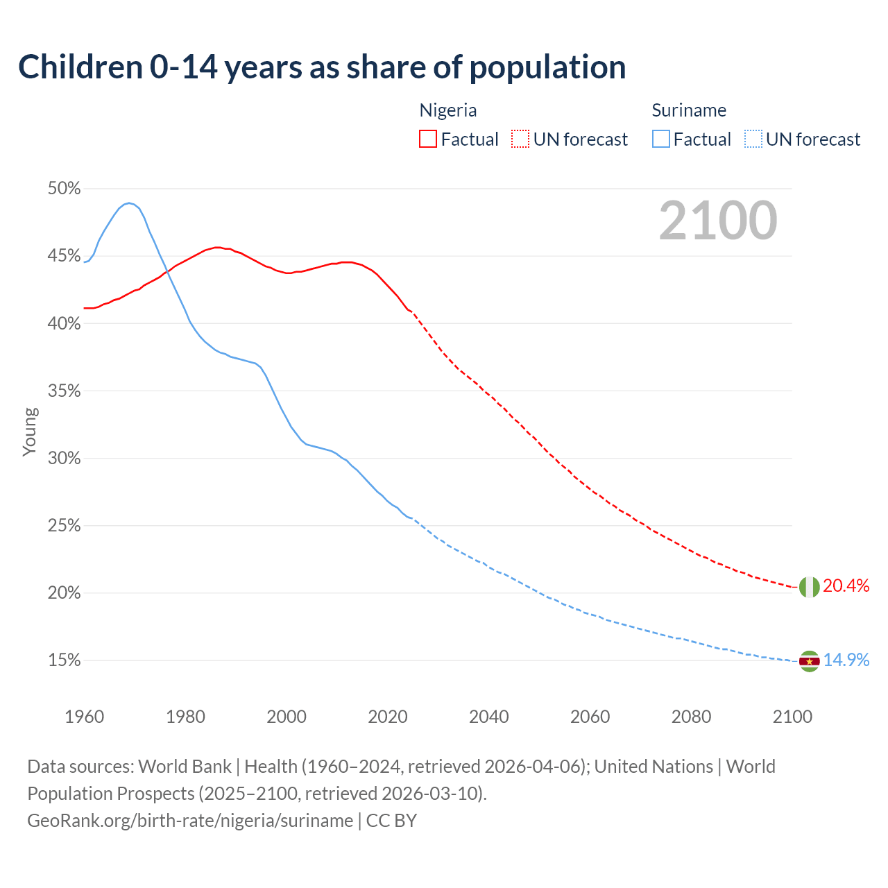 According to the latest available data on birth rates, the fertility rate in Nigeria was 4.48 children per woman in 2023, compared to 2.25 in Suriname in 2023. The replacement level is considered to be 2.1 children per woman.