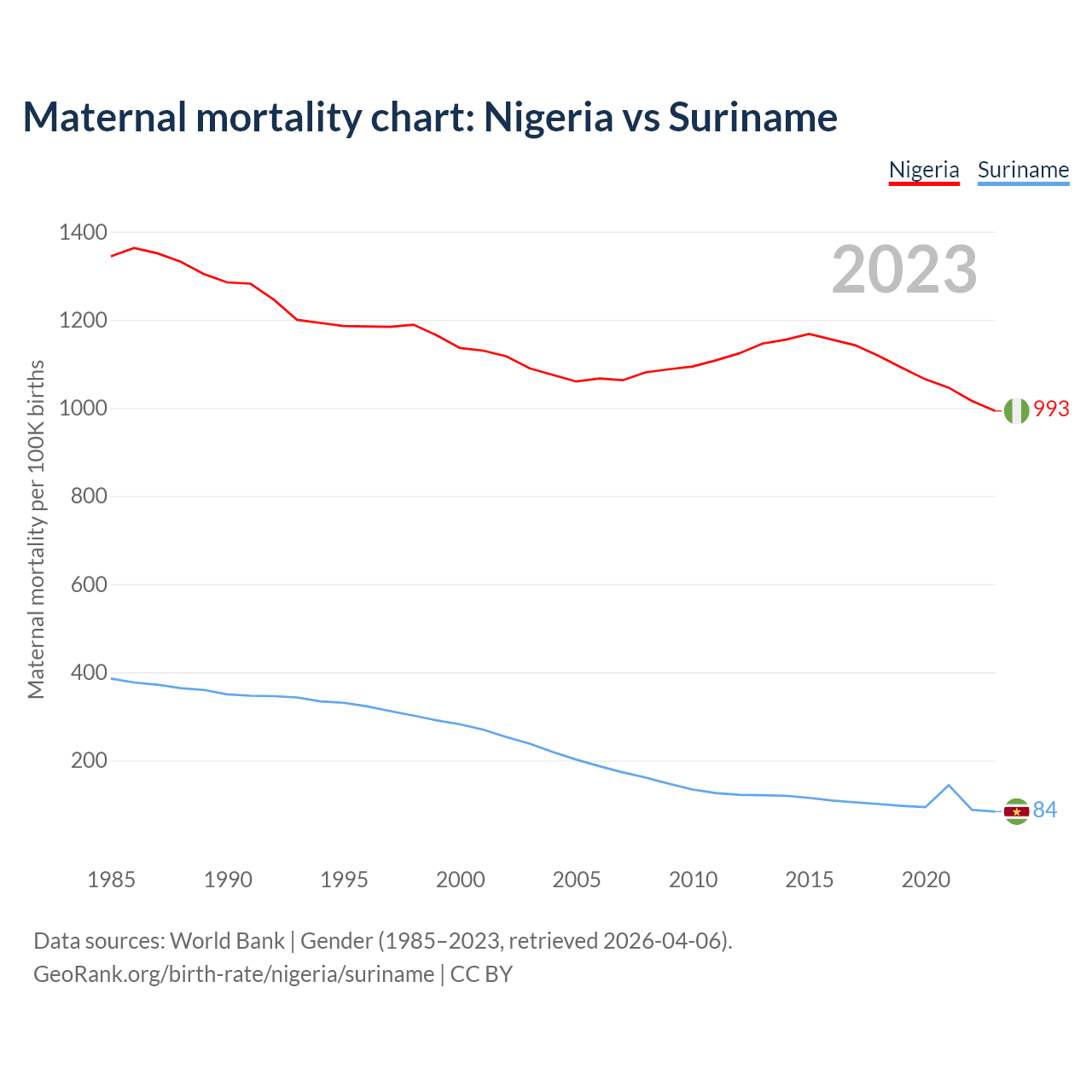 The maternal mortality rate, which is the probability of dying during childbirth or within 42 days of pregnancy termination, is 993 deaths per 100,000 live births in Nigeria, compared to 84 deaths in Suriname.