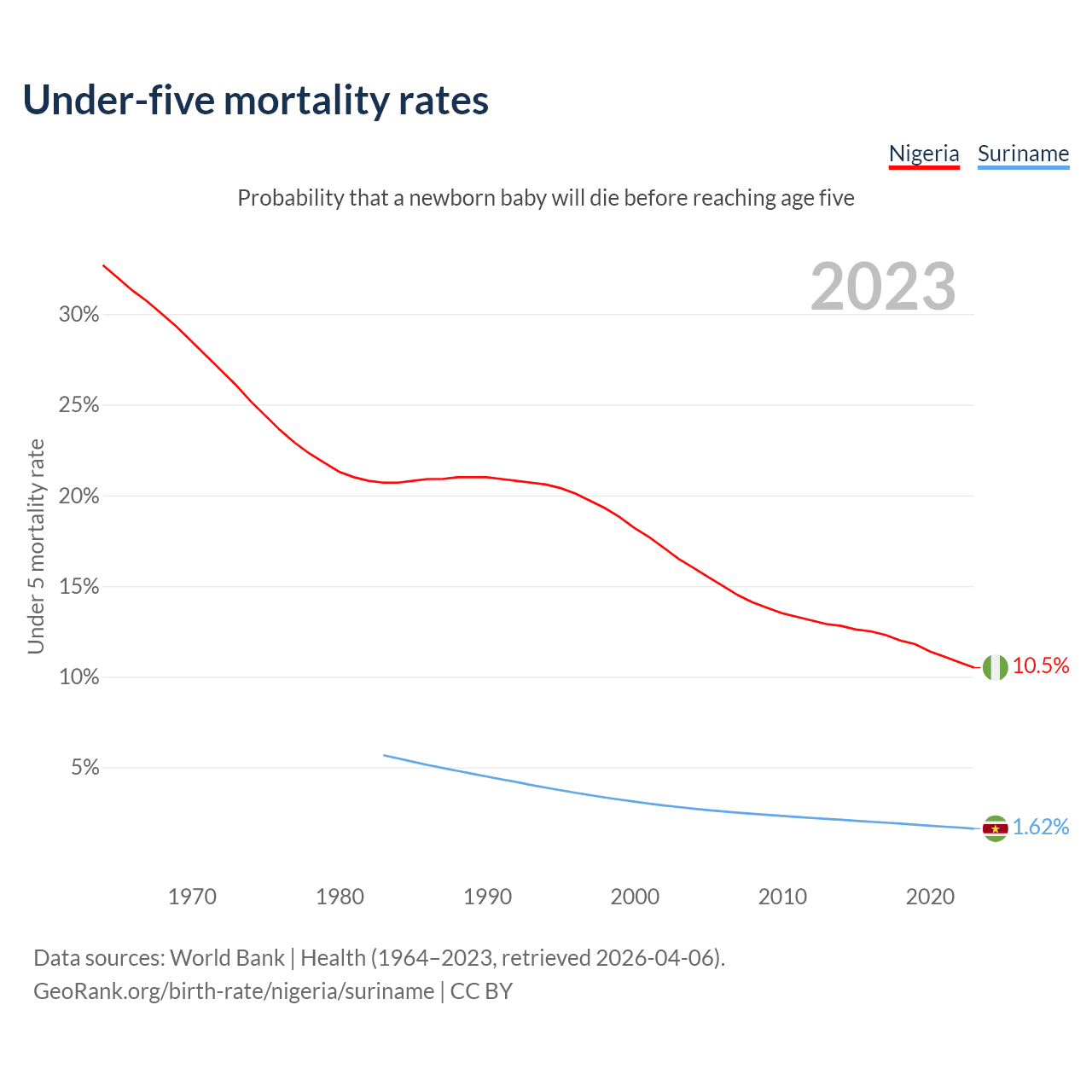 The chance that a newborn baby will die before reaching age five is 10.5% in Nigeria and 1.62% in Suriname. Above is a chart with historical data on under-five mortality rates.