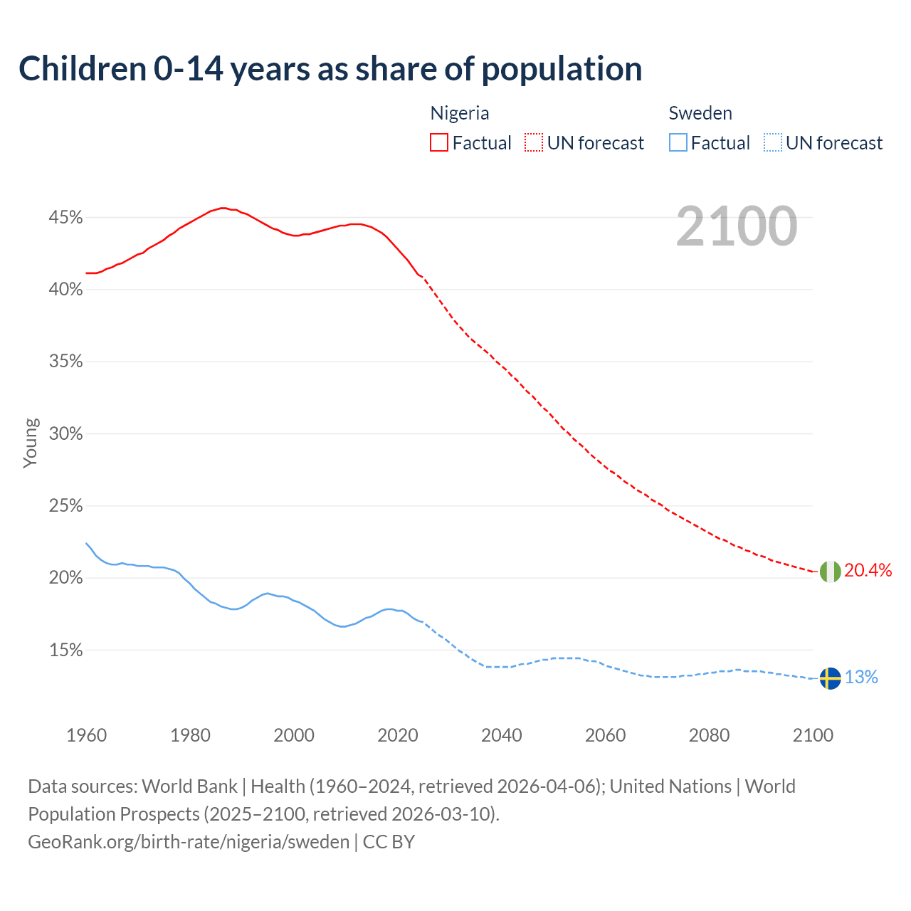 According to the latest available data on birth rates, the fertility rate in Nigeria was 4.48 children per woman in 2023, compared to 1.45 in Sweden in 2023. The replacement level is considered to be 2.1 children per woman.
