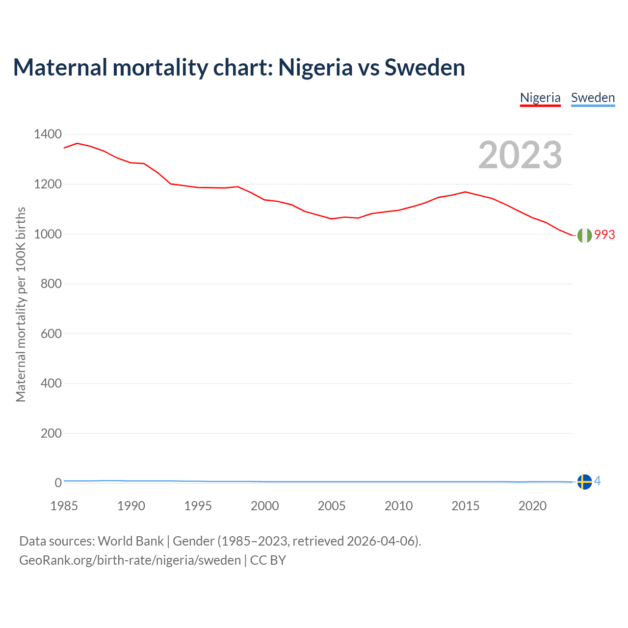 The maternal mortality rate, which is the probability of dying during childbirth or within 42 days of pregnancy termination, is 993 deaths per 100,000 live births in Nigeria, compared to 4 deaths in Sweden.