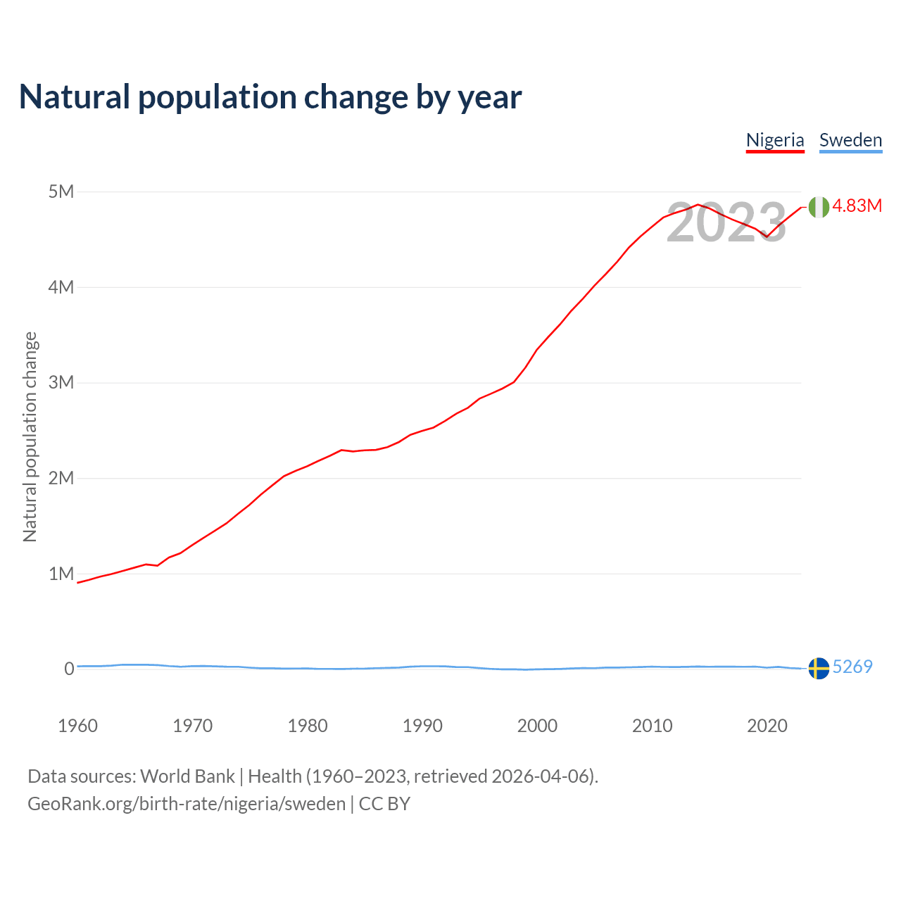 Nigeria has an annual birth rate of 33 births per 1,000 people, compared to 9.5 for Sweden. The average number of children a woman is expected to have during her lifetime — the fertility rate, is 4.48 in Nigeria and 1.45 in Sweden — 67.6% difference.