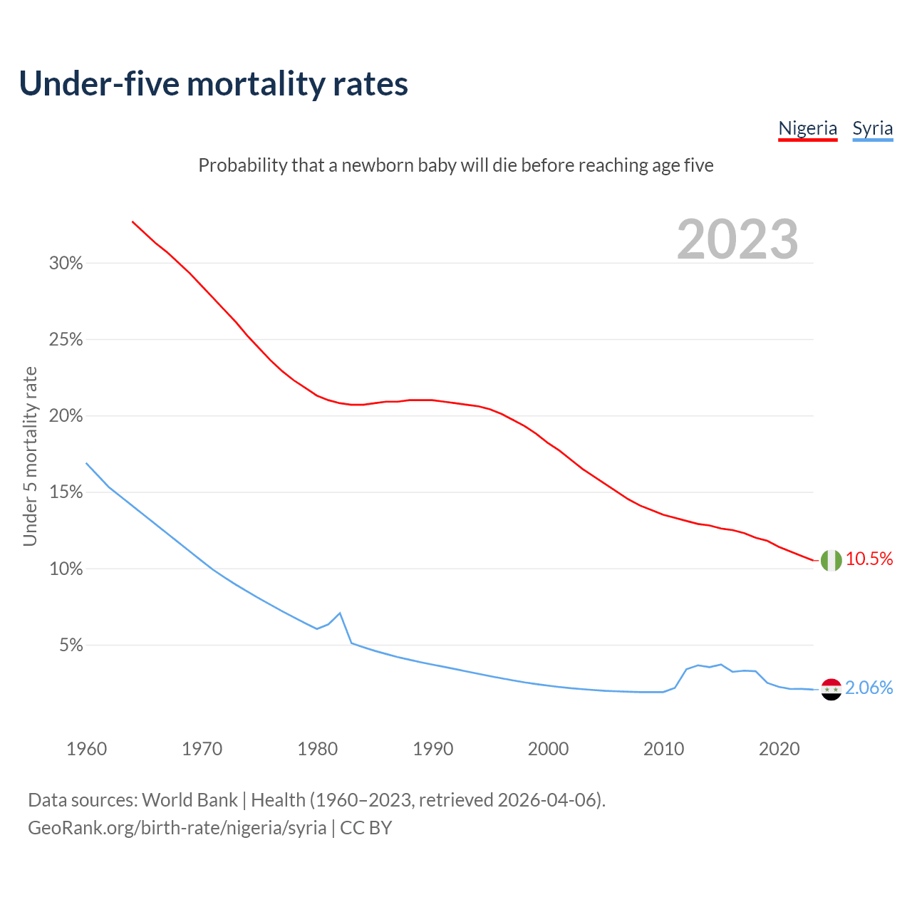 The chance that a newborn baby will die before reaching age five is 10.5% in Nigeria and 2.06% in Syria. Above is a chart with historical data on under-five mortality rates.