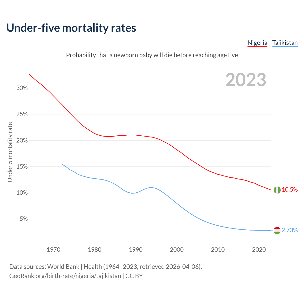 The chance that a newborn baby will die before reaching age five is 10.5% in Nigeria and 2.73% in Tajikistan. Above is a chart with historical data on under-five mortality rates.