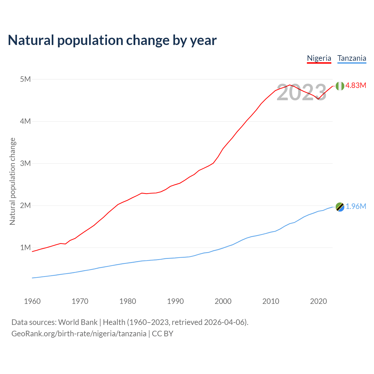According to the latest available data on birth rates, the fertility rate in Nigeria was 4.48 children per woman in 2023, compared to 4.61 in Tanzania in 2023. The replacement level is considered to be 2.1 children per woman.