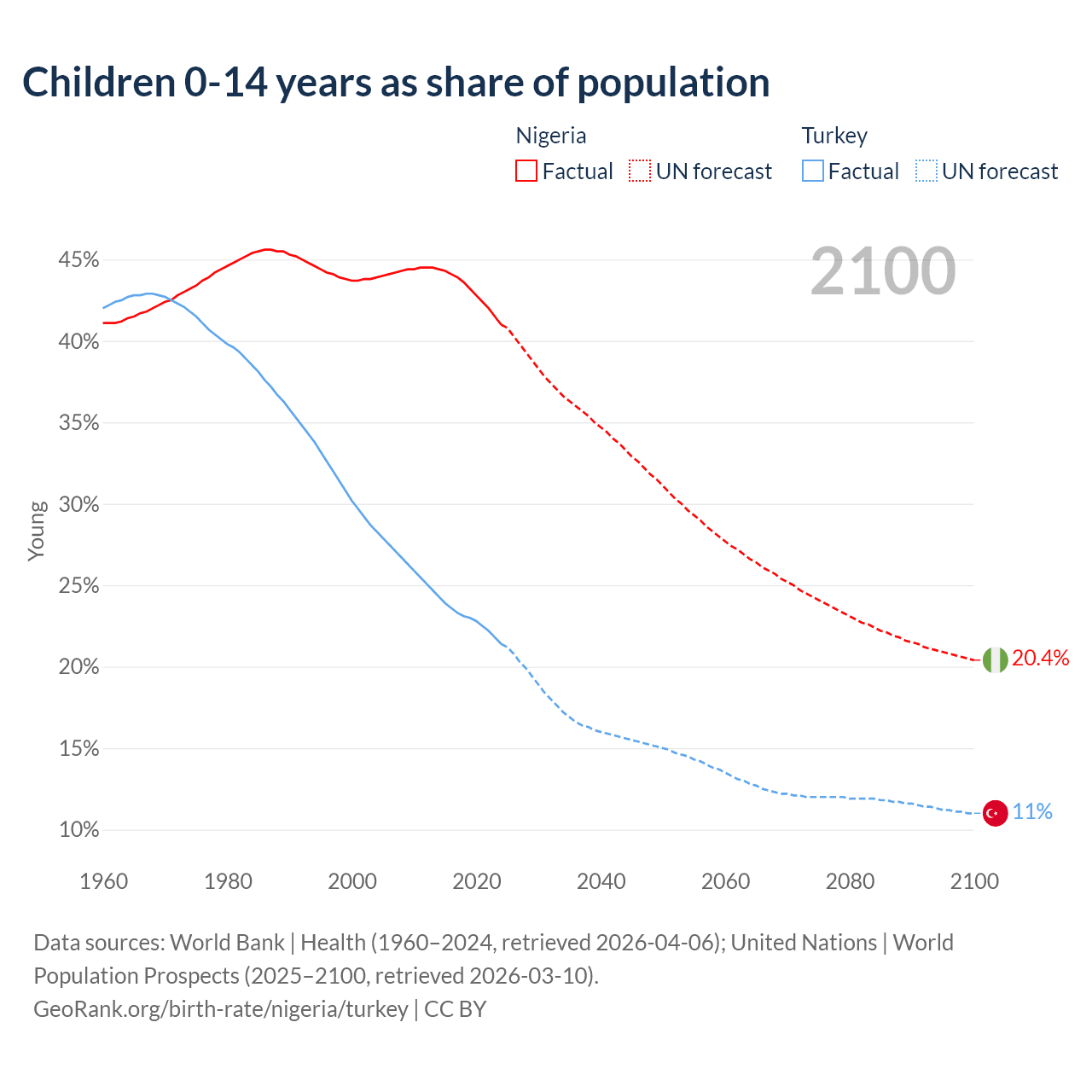 According to the latest available data on birth rates, the fertility rate in Nigeria was 4.48 children per woman in 2023, compared to 1.51 in Turkey in 2023. The replacement level is considered to be 2.1 children per woman.
