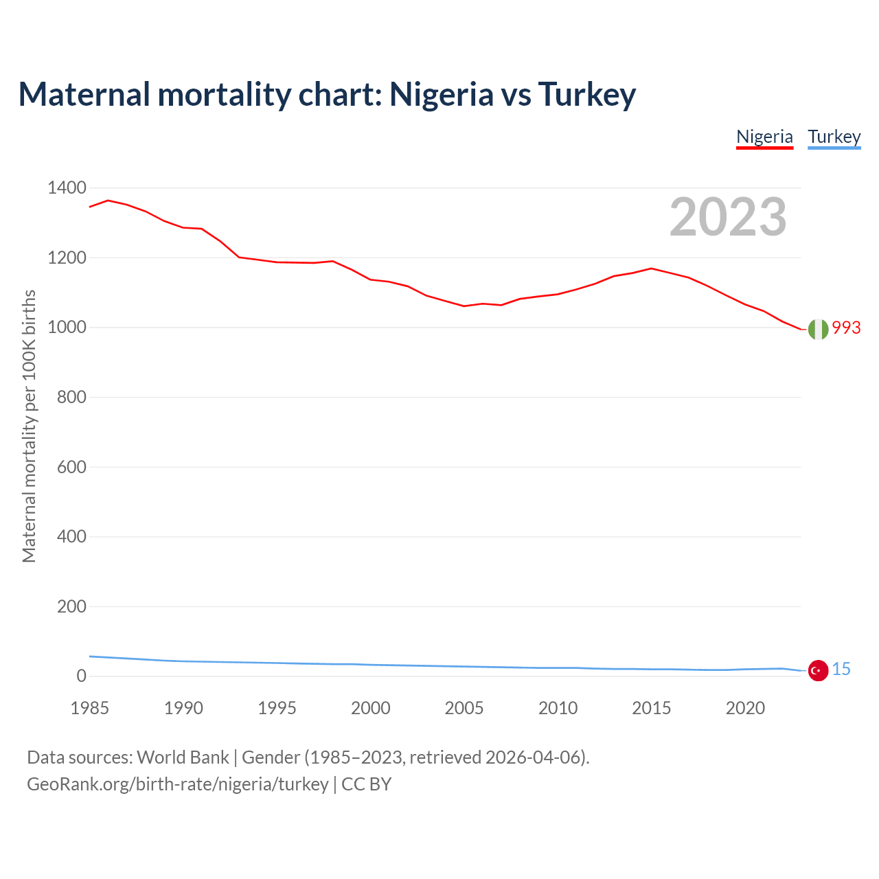 The maternal mortality rate, which is the probability of dying during childbirth or within 42 days of pregnancy termination, is 993 deaths per 100,000 live births in Nigeria, compared to 15 deaths in Turkey.