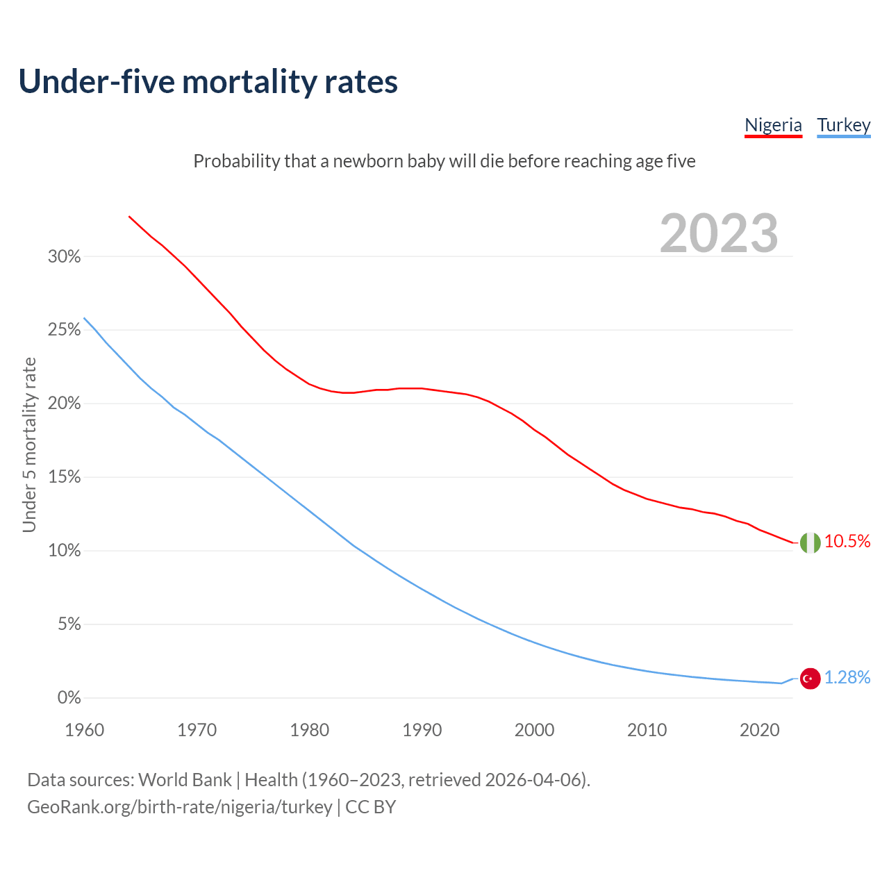 The chance that a newborn baby will die before reaching age five is 10.5% in Nigeria and 1.28% in Turkey. Above is a chart with historical data on under-five mortality rates.