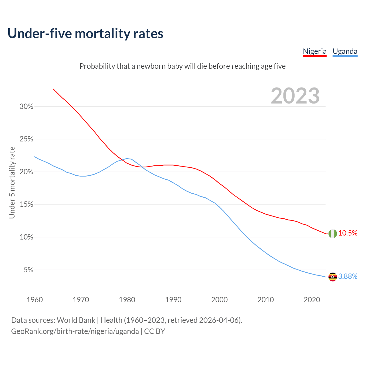 The chance that a newborn baby will die before reaching age five is 10.5% in Nigeria and 3.88% in Uganda. Above is a chart with historical data on under-five mortality rates.