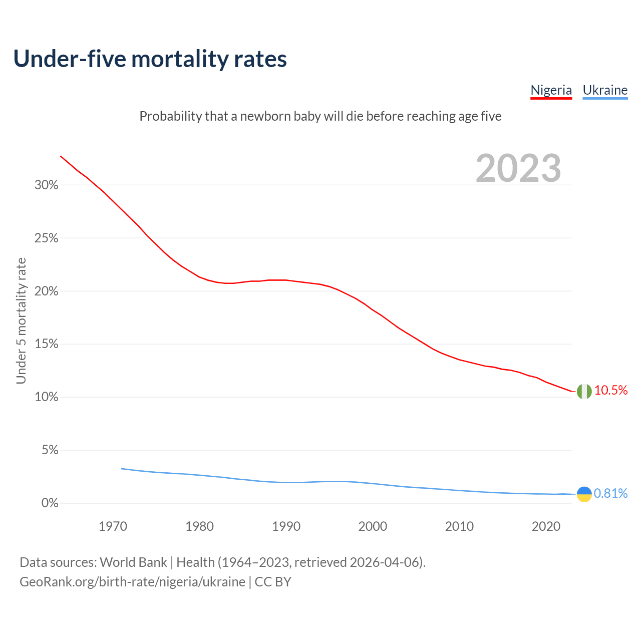The chance that a newborn baby will die before reaching age five is 10.5% in Nigeria and 0.81% in Ukraine. Above is a chart with historical data on under-five mortality rates.