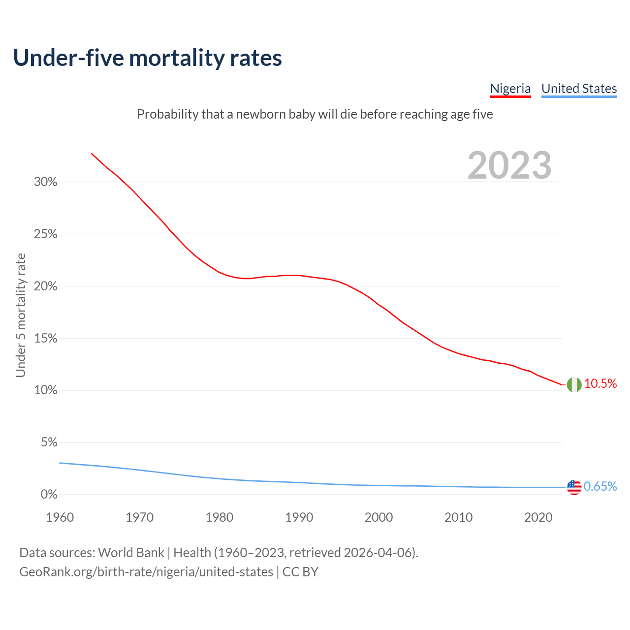The chance that a newborn baby will die before reaching age five is 10.5% in Nigeria and 0.65% in the United States. Above is a chart with historical data on under-five mortality rates.