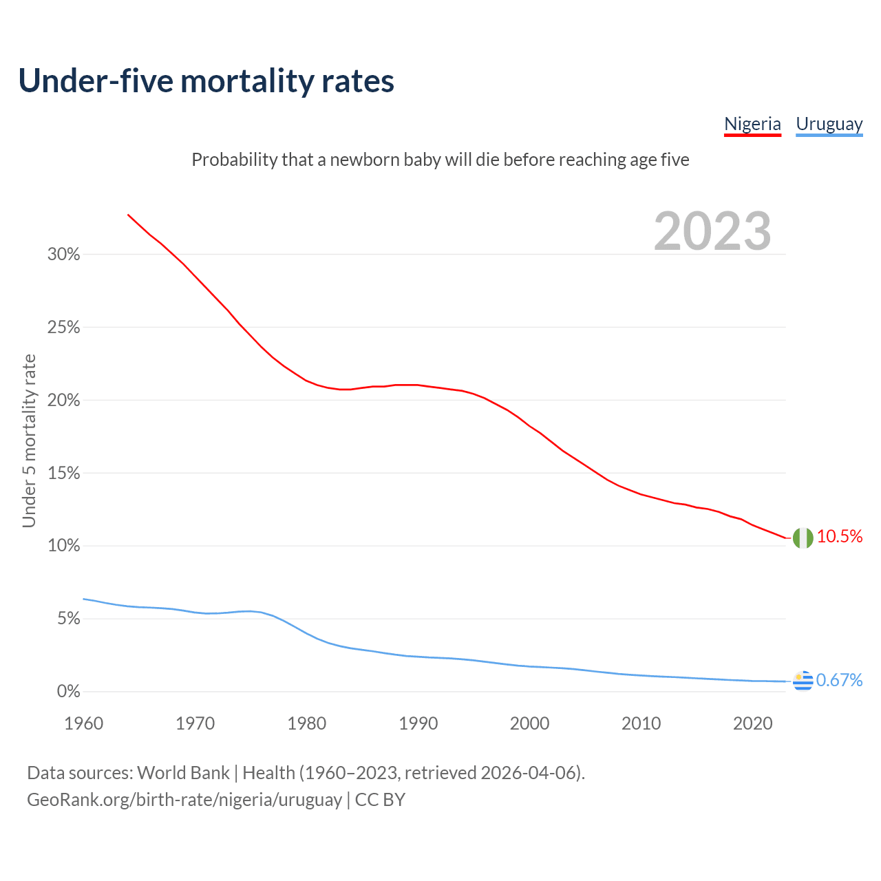 The chance that a newborn baby will die before reaching age five is 10.5% in Nigeria and 0.67% in Uruguay. Above is a chart with historical data on under-five mortality rates.