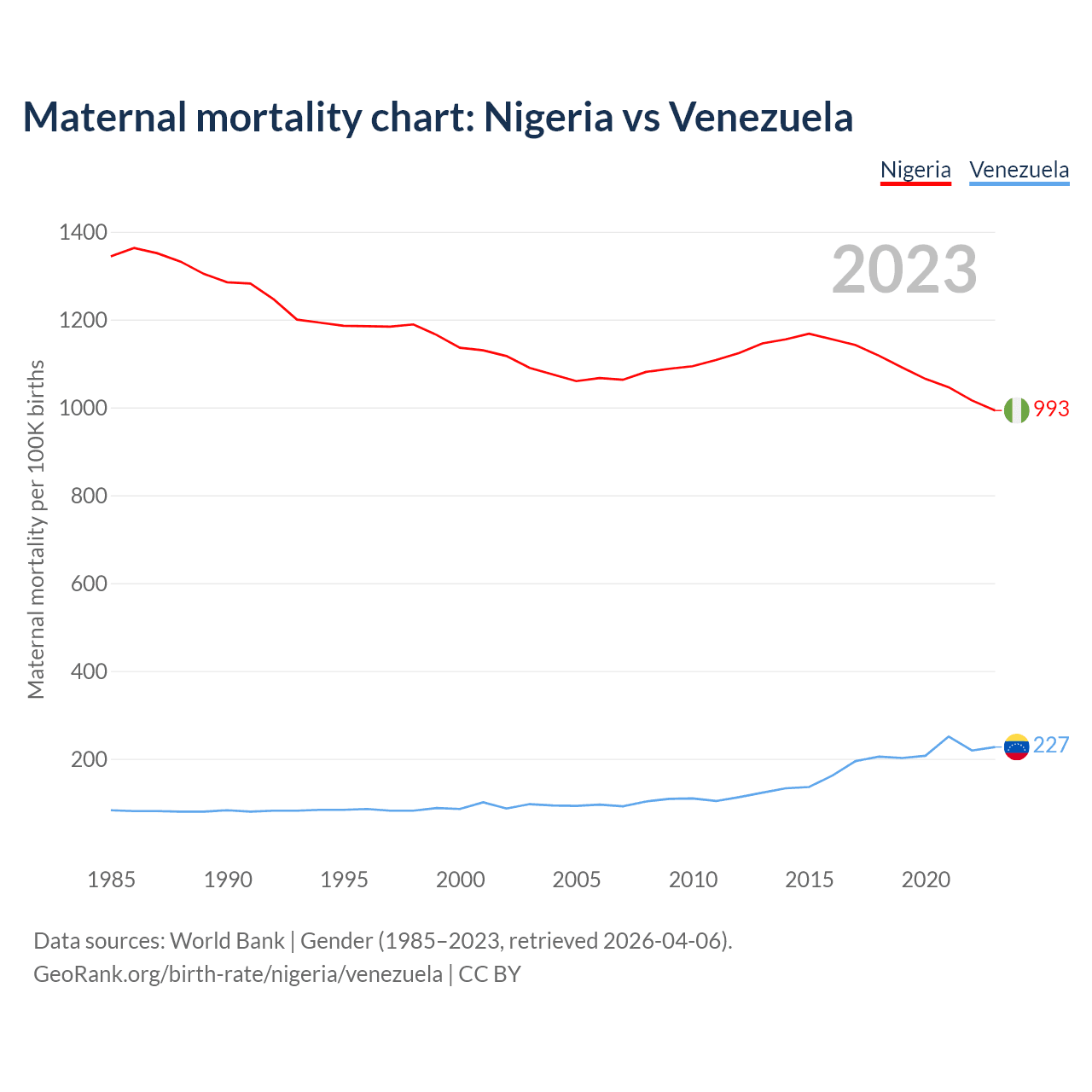 The maternal mortality rate, which is the probability of dying during childbirth or within 42 days of pregnancy termination, is 993 deaths per 100,000 live births in Nigeria, compared to 227 deaths in Venezuela.