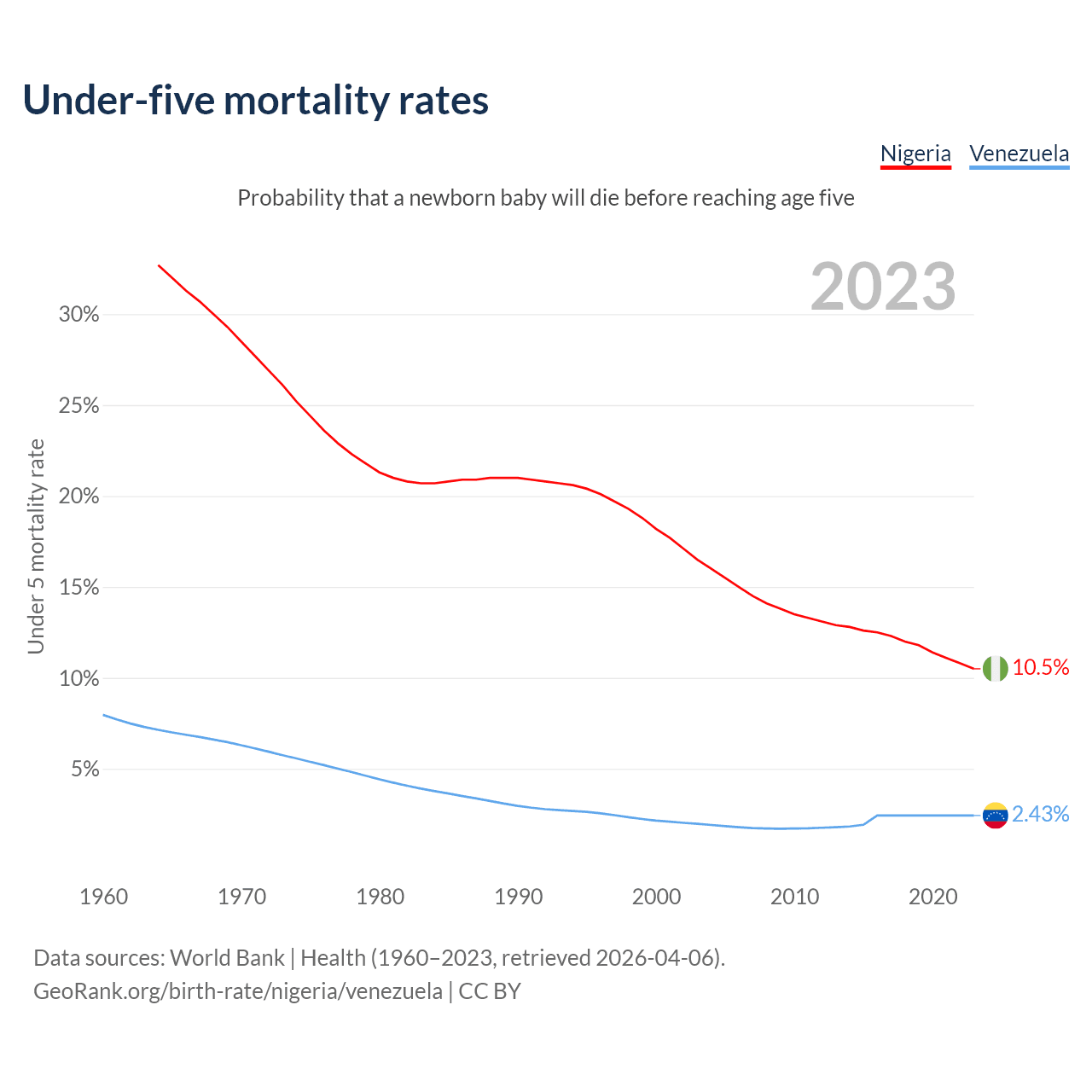 The chance that a newborn baby will die before reaching age five is 10.5% in Nigeria and 2.43% in Venezuela. Above is a chart with historical data on under-five mortality rates.
